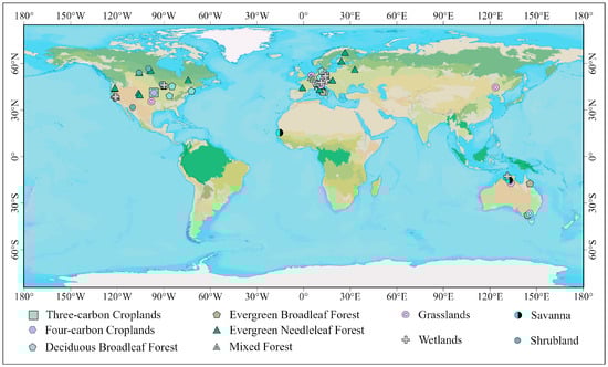 We selected 76 Tier-1 eddy covariance flux sites from the FLUXNET2015 dataset that represent diverse biomes and are globally distributed, primarily across Europe and North America, with additional sites located in Asia and Africa (Figure 1). Based on the widely adopted International Geosphere-Biosphere Programme (IGBP) classification system for global and regional ecosystem studies [37], these sites were categorized into ten vegetation types: cropland (CRO), savannas (SAV), mixed forest (MF), evergreen needleleaf forest (ENF), deciduous broadleaf forest (DBF), evergreen broadleaf forest (EBF), shrubland (SHR), grasslands (GRA), and wetlands (WET). To enable refined carbon flux analysis, cropland sites were further classified into C3 and C4 crops according to crop type in the rotation year. The distinction between C3 and C4 crops lies in their different photosynthetic carbon assimilation pathways and ecological adaptability [38]. C4 crops (e.g., maize) exhibit significant advantages under hot and dry conditions [39], while C3 crops (e.g., wheat, rice) dominate in cooler and temperate climates.