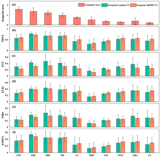 The grouping error bars are (a) the footprint area distribution of different vegetation types, and (b–f) the average values (±standard error) of NDVI, EVI, EVI2, NIRv and kNDVI of Landsat and MODIS data in the flux footprint of each vegetation type. The height of each column represents the average value, and the error column represents the standard error of the average value.