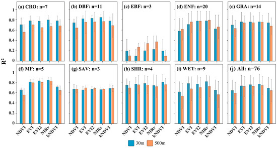 The R2 values over the 76 sites were then stratified by vegetation types. For each vegetation type, the R2 values, representing the footprint–VI–GPP relationship, were calculated as the mean value over all the sites within the same vegetation type. The R2 values for all ten vegetation types, both at 30 m and 500 m spatial resolution, are illustrated in Figure 3a–i. The potentiality of each MODIS-footprint VI varied by vegetation type in estimating GPP. Overall, DBF (averaged R2 = 0.58~0.75), ENF (averaged R2 = 0.61~0.79), GRA (averaged R2 = 0.63~0.75), and MF (averaged R2 = 0.56~0.83) had the highest correlation with tower GPP, followed by CRO (averaged R2 = 0.56–0.70), SAV (averaged R2 = 0.67~0.69), SHR (averaged R2 = 0.69~0.76), and WET (averaged R2 = 0.54~0.72). EBF had the poorest relationship with GPP (averaged R2 = 0.10~0.37). Meanwhile, Landsat-footprint VIs are similar to MODIS-footprint VIs for GPP estimation with DBF (averaged R2 = 0.74~0.84), ENF (averaged R2 = 0.58~0.78), GRA (averaged R2 = 0.70~0.76), MF (averaged R2 = 0.65~0.84), CRO (averaged R2 = 0.71~0.80), SAV (averaged R2 = 0.65~0.68), SHR (averaged R2 = 0.74~0.80), WET (averaged R2 = 0.62~0.82), and EBF (averaged R2 = 0.10~0.23). Notably, each Landsat-footprint VI improved the performance of GPP estimation by 15% for CRO, followed by 10% for DBF, 8% for WET, 7% for GRA, and 5% for SHR. This demonstrated that the advantage of the high spatial resolution for GPP estimation varied across vegetation types.
