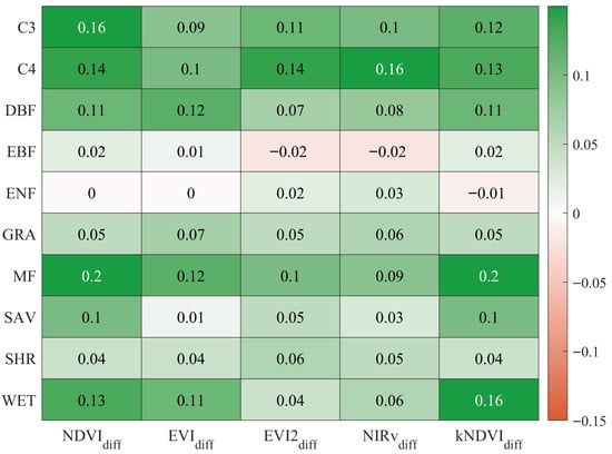 The differences in explanatory power (ΔR2) for tower GPP between Landsat-footprint VIs and MODIS-footprint VIs across vegetation types. Green shadow indicates better performance of Landsat-derived VIs, with darker green representing stronger improvement in model accuracy.