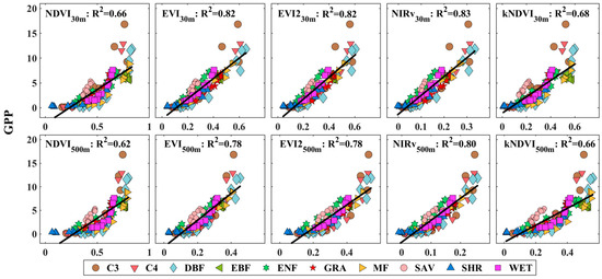 The relationship of monthly VIs both at 30 m and 500 m spatial resolution with tower GPP for ten vegetation types.