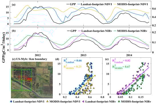 (a): The seasonal cycle of Landsat-footprint NDVI and MODIS-footprint NDVI with tower GPP. (b): The seasonal cycle of Landsat-footprint NIRv and MODIS-footprint NIRv with tower GPP. (c) The footprint boundary of the US-Myb site derived from Landsat and MODIS data. The red irregular ellipse represents the Landsat footprint boundary, and the green rectangle represents the MODIS footprint boundary. (d,e): The scatter plot of the Landsat-footprint NDVI and Landsat-footprint NIRv with tower GPP, respectively.