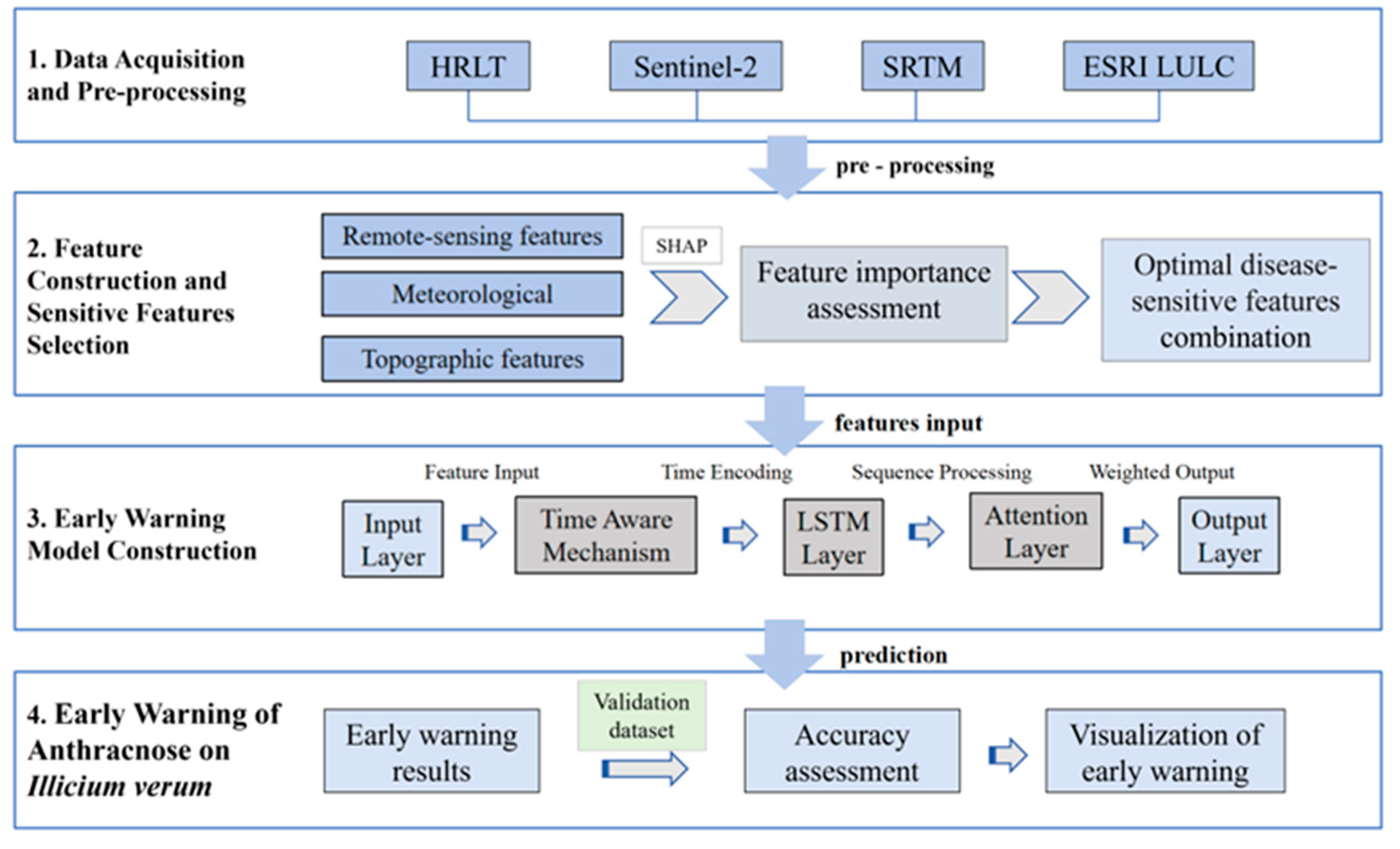 - Proposed an early warning framework for anthracnose on I. verum by integrating high-frequency environmental data (meteorological and topographic) with Sentinel-2 time-series imagery.