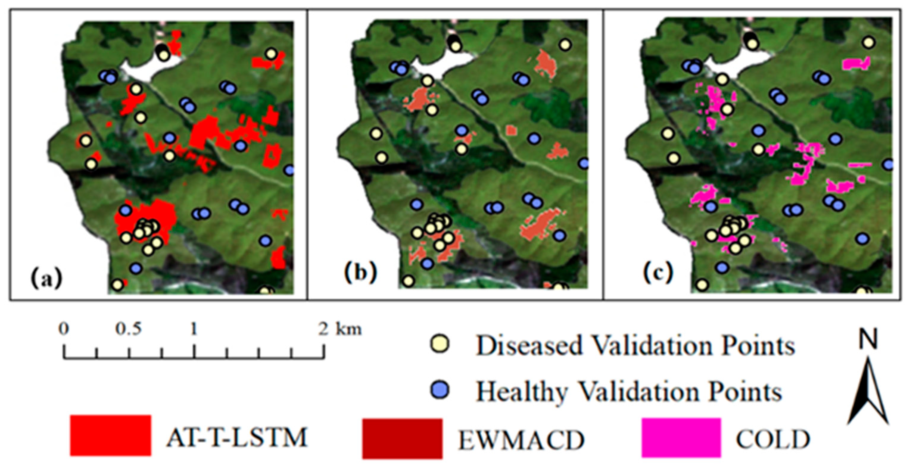 4.2.3. Comparison of Spatial Accuracy Between At-T-LSTM and Time Series Change Detection Algorithms