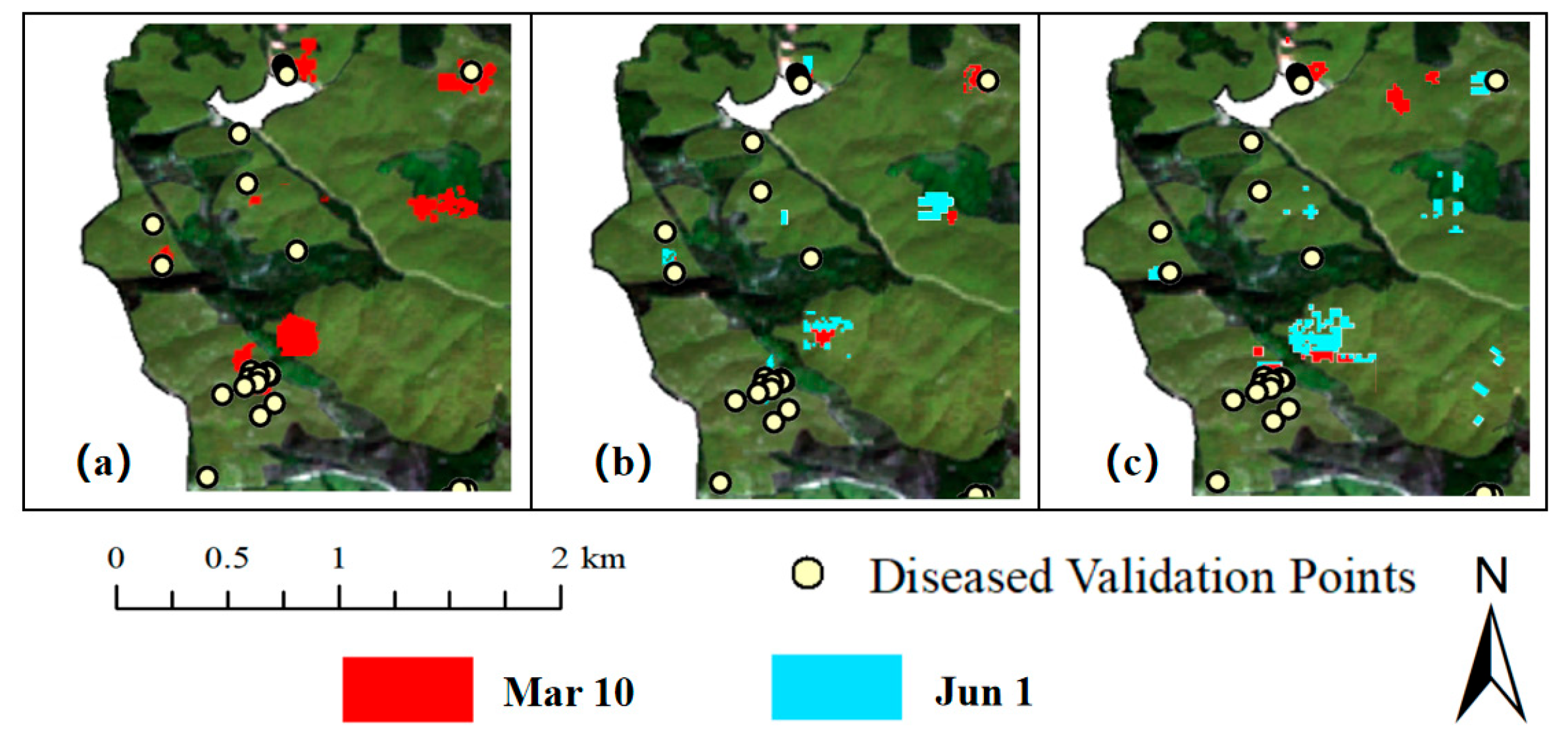 - Tong, T.; Lin, S.; Li, L.; Luo, T.; Huang, H. Remote sensing recognition of pine wilt disease in Pinus massoniana forest combined with microwave and optical time series images. J. Beijing For. Univ. 2024, 46, 40–52. [Google Scholar]