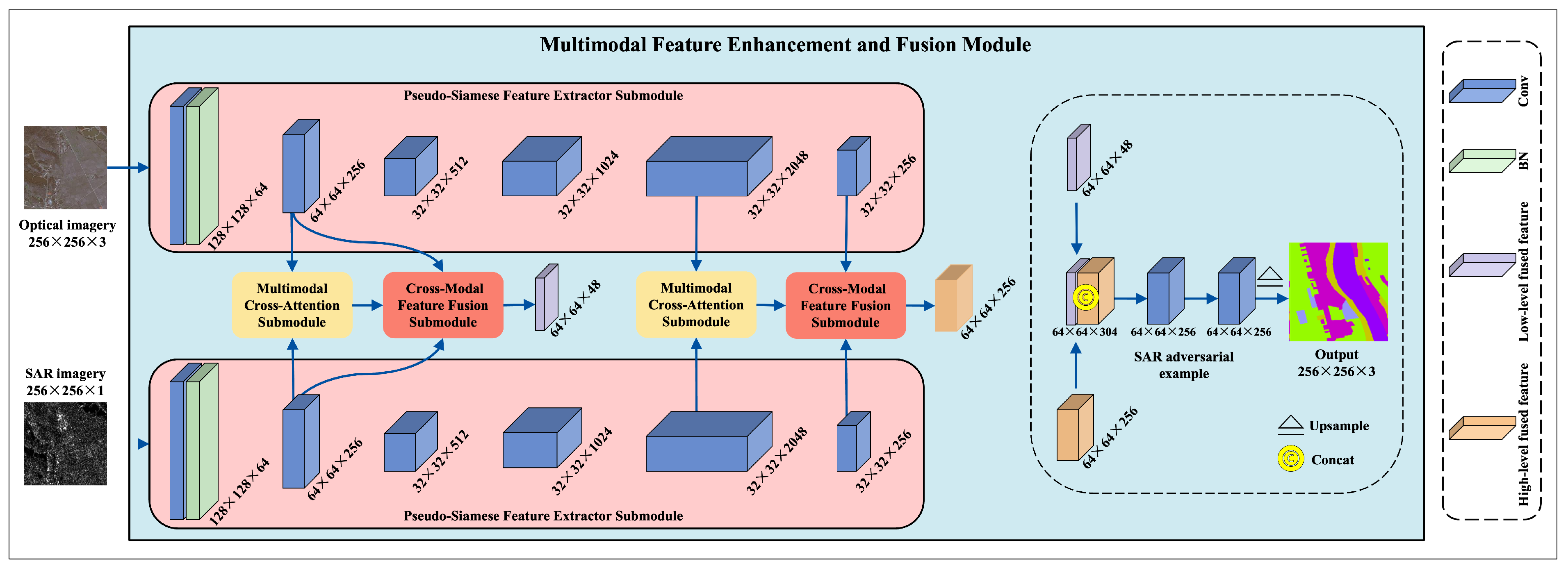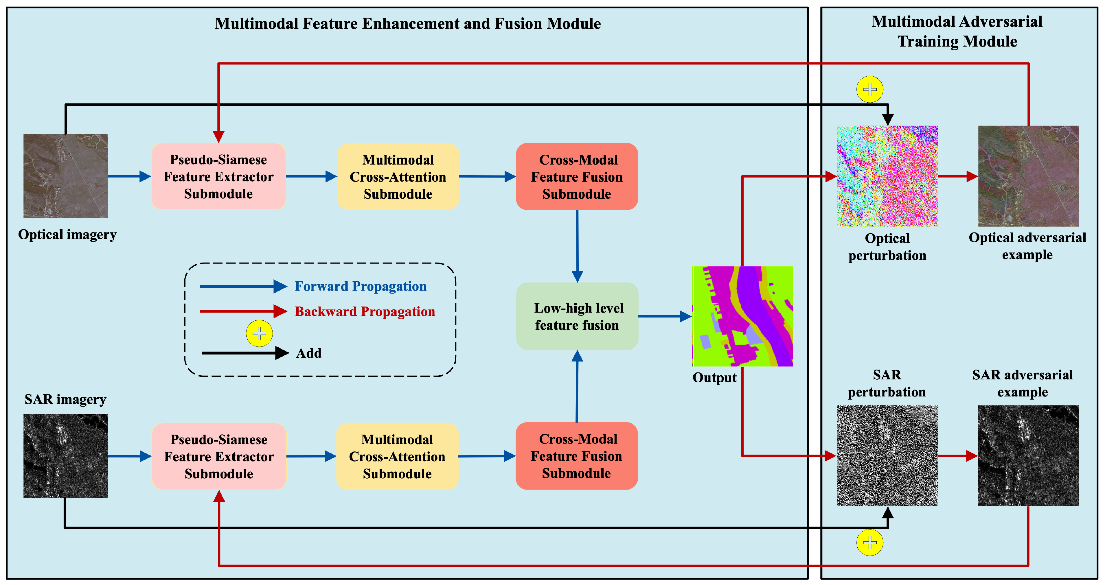 Data Processing and Experimental Details: During the preprocessing phase, the original remote sensing images were cropped into nonoverlapping patches of size . From these, a total of 8850 image slices were randomly selected to construct the experimental sample set. The dataset was subsequently split into training and testing subsets at a ratio of 8:2 to evaluate the performance of multimodal adversarial attacks and defence strategies.