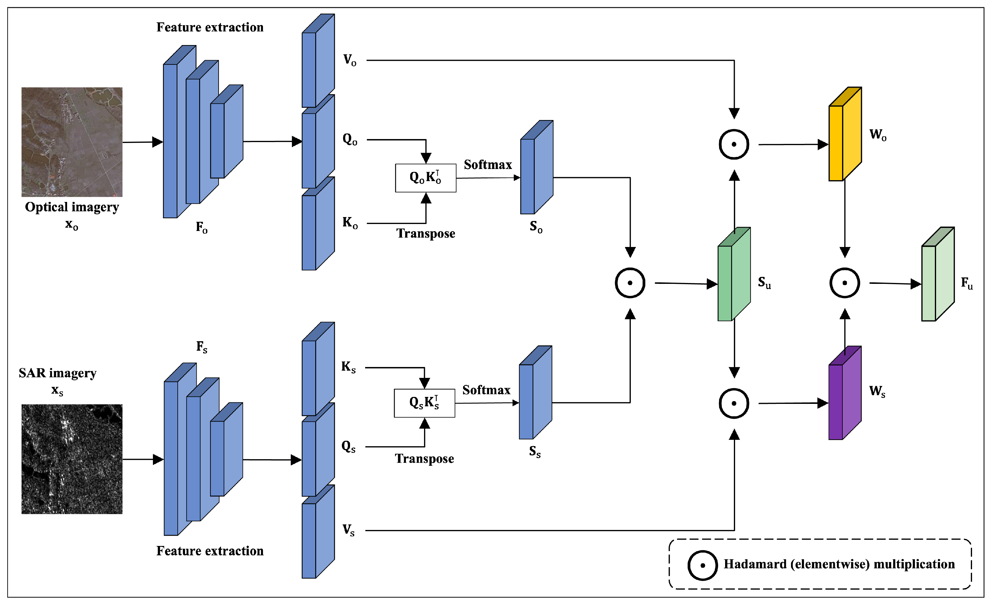 Table 2. As shown in the table, perturbations applied to the optical modality exhibit a significantly stronger attack effect than those targeting the SAR modality do. For example, under the FGSM attack, the model’s OA decreases from 0.8779 to 0.7178 when the optical modality is attacked, whereas attacking only the SAR modality results in a smaller decline to 0.7682. Iterative attacks such as PGD and MIM, which leverage multistep optimization, are generally more destructive than single-step FGSM. Nevertheless, the OA of the SAR modality remains relatively high even under these stronger attacks, demonstrating superior adversarial robustness. This performance gap may stem from the intrinsic differences in sensing mechanisms and feature representations between the two modalities. Optical imagery heavily relies on fine-grained visual features such as colour and texture, making it more sensitive to pixel-level perturbations. In contrast, SAR imagery, owing to its unique imaging process and inherent robustness to noise, preserves semantic consistency more effectively when exposed to adversarial interference, thereby exhibiting stronger resistance to attacks.
