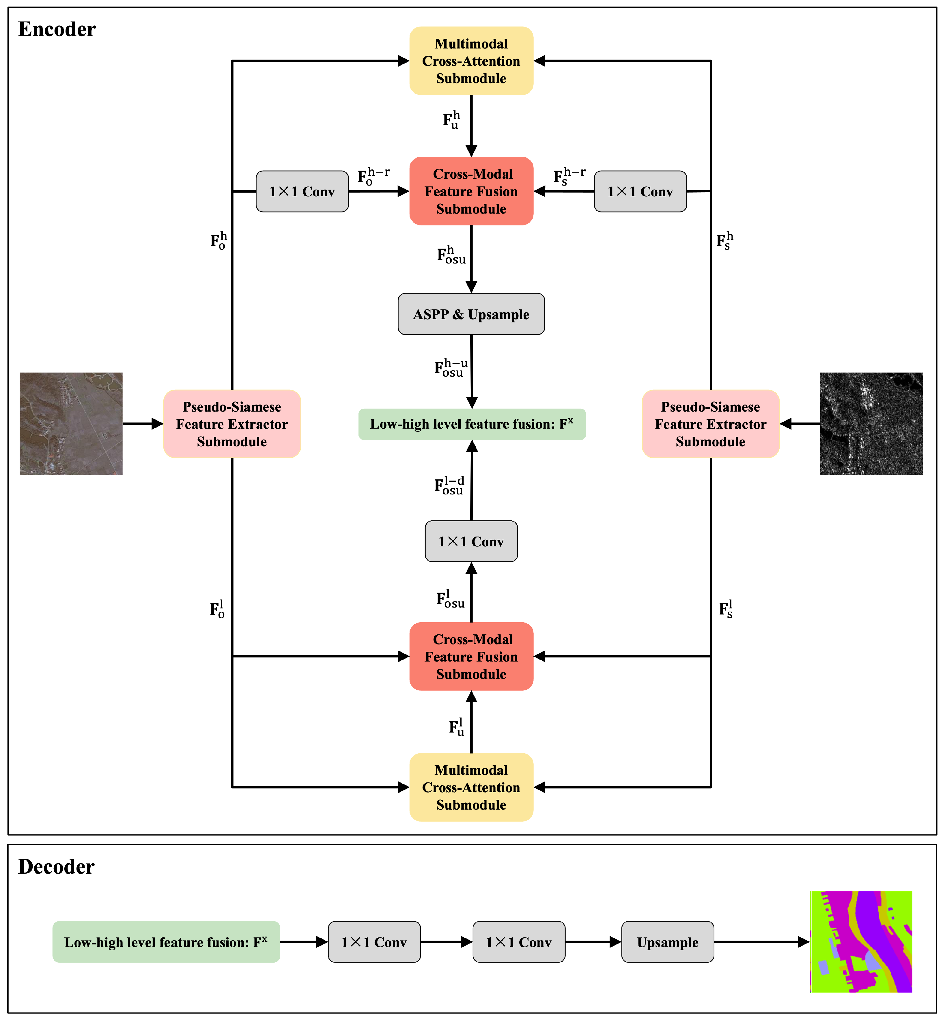 pixels. The optical images are acquired from the GF-1 satellite (with a resolution of 2 m), while the SAR images are obtained from the GF-3 satellite (with a resolution of 5 m). To ensure pixelwise alignment, the optical images are resampled to a 5 m resolution using bilinear interpolation and aligned with the SAR images at subpixel accuracy. Pixel-level land use labels are generated based on the 2017 National Land Use Change Survey in China. The dataset contains seven land cover categories: cropland, urban, rural, water, forestland, road, and others.