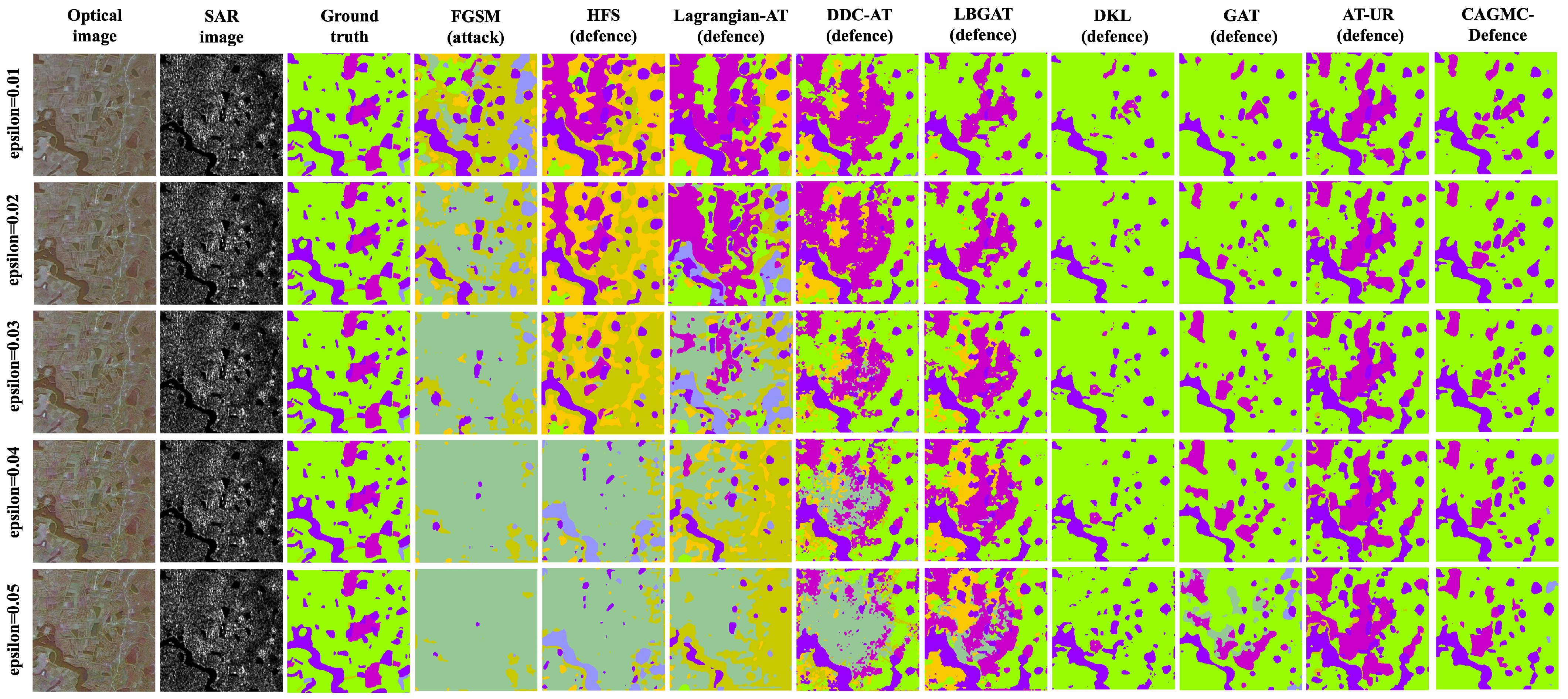 Table 5 report the overall accuracy (OA) and kappa coefficient of each method under varying perturbation strengths, providing a quantitative assessment of their adversarial robustness.