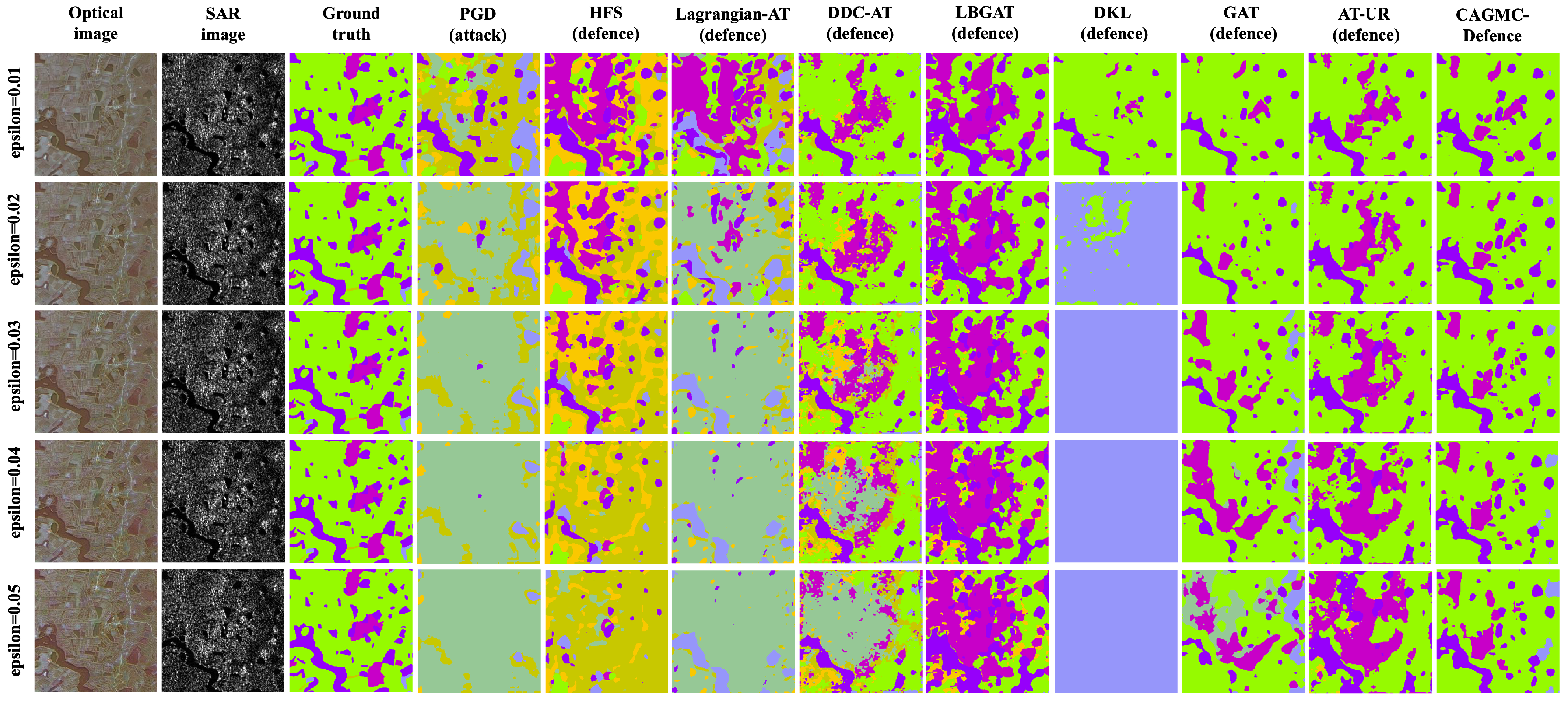 In summary, the above experimental results comprehensively demonstrate the robustness advantages of CAGMC-Defence in multimodal remote sensing image recognition tasks under various adversarial attacks. CAGMC-Defence not only significantly improves recognition accuracy under clean conditions but also maintains stable defence performance against a range of complex attack strategies. These results highlight its strong generalizability and practical applicability. Visual comparisons of different defence methods under various adversarial attacks are illustrated in