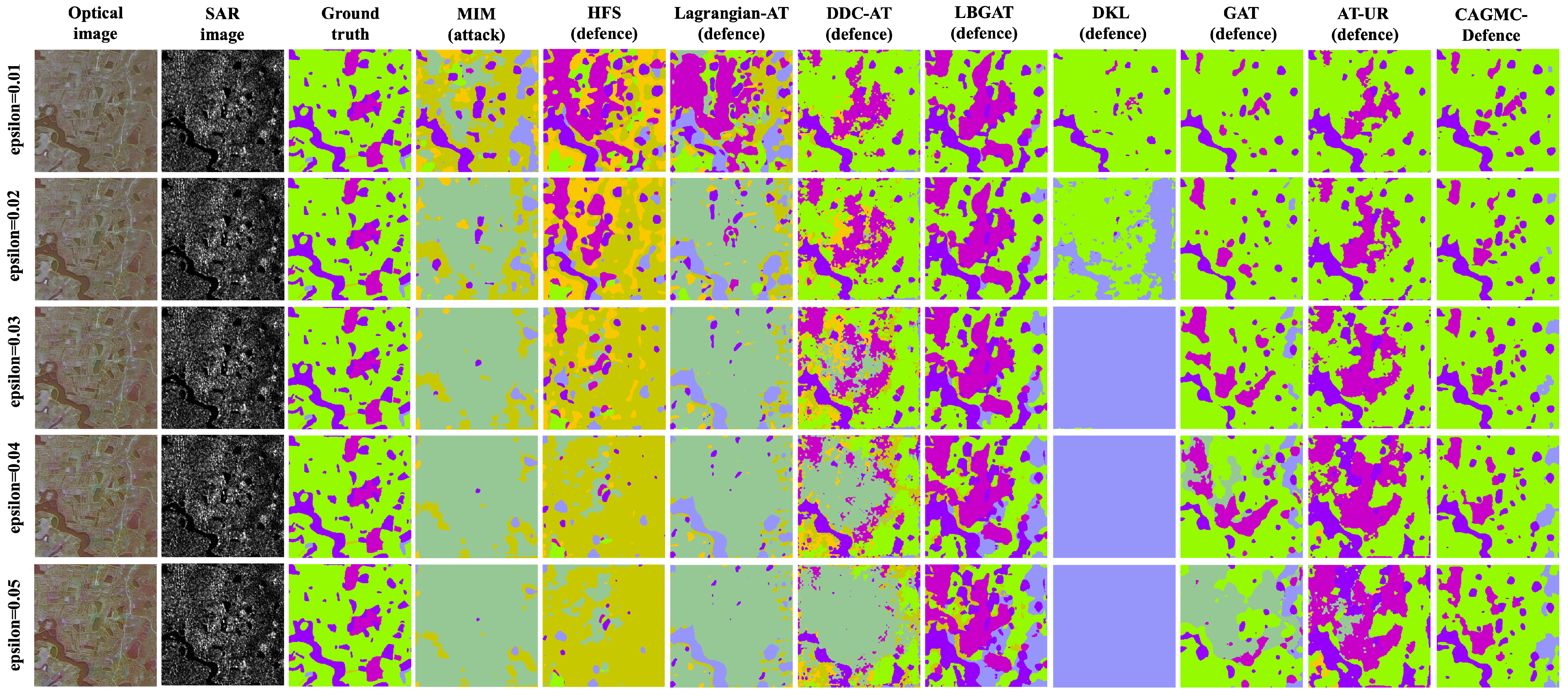 Specifically, when the optical modality was attacked by the FGSM, PGD, and MIM, the OA of the undefended model decreased to 0.7178, 0.6815, and 0.6637, respectively. With CAGMC-Defence, the OA increased to 0.8841, 0.8813, and 0.8741, representing improvements of 16.63%, 19.98%, and 21.04%, respectively, effectively mitigating performance degradation caused by the perturbations. Similarly, when the SAR modality was attacked, the OA values of the original model were 0.7682, 0.7671, and 0.7658, whereas those of the defended model reached 0.8820, 0.8791, and 0.8649, corresponding to relative gains of 11.37%, 11.20%, and 9.91%, respectively. These results highlight the model’s strong crossmodal robustness. Notably, the proposed method outperformed even the clean-sample baseline in certain unimodal attack scenarios, demonstrating its effective use of redundant modalities and its ability to suppress corrupted inputs. Overall, the results confirm that CAGMC-Defence is not only effective against joint multimodal attacks but also provides stable and significant protection under challenging unimodal attack conditions, greatly reducing the impact of adversarial perturbations on model performance.