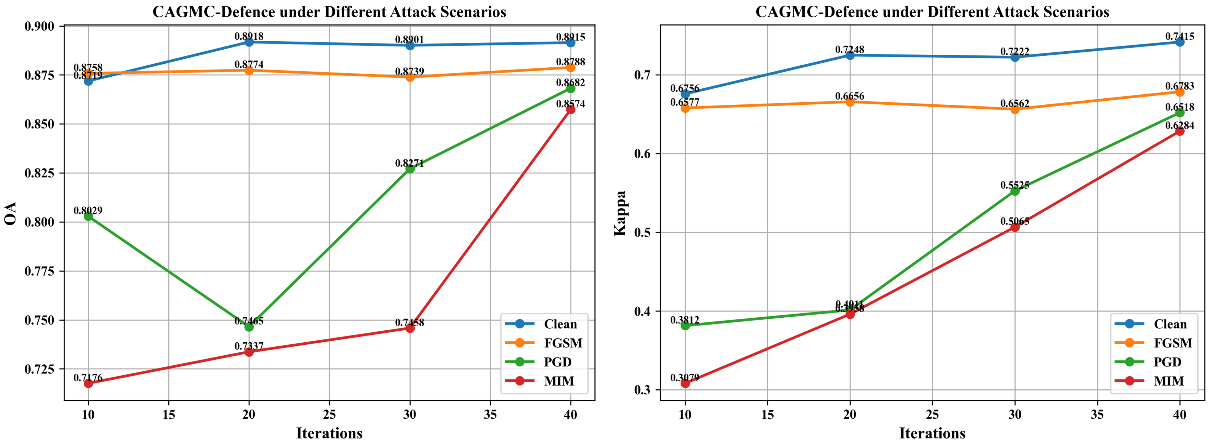 In addition, under FGSM attacks, CAGMC-Defence consistently maintained an OA of approximately 0.87, with kappa values ranging narrowly between 0.65 and 0.68, indicating the high robustness of the defence model against this type of attack. In contrast, under PGD attacks, the model experienced a notable performance decrease at epoch 20, with the OA decreasing to 0.7465 and the kappa coefficient decreasing to 0.4011, suggesting that the attack effectively compromised the model’s defence at this stage. However, as training progressed to epoch 40, the OA recovered to 0.8682, and the kappa value increased to 0.6518, demonstrating that the model gradually strengthens its resistance to stronger attacks through adversarial training. In the case of MIM attacks, the OA remained below 0.75 between epochs 10 and 30, indicating that the momentum-based gradient accumulation mechanism can more easily overcome static defence strategies. Nevertheless, by epoch 40, the OA increased to 0.8574, reflecting the robust defence capability of CAGMC-Defence even under high-order adversarial attacks.