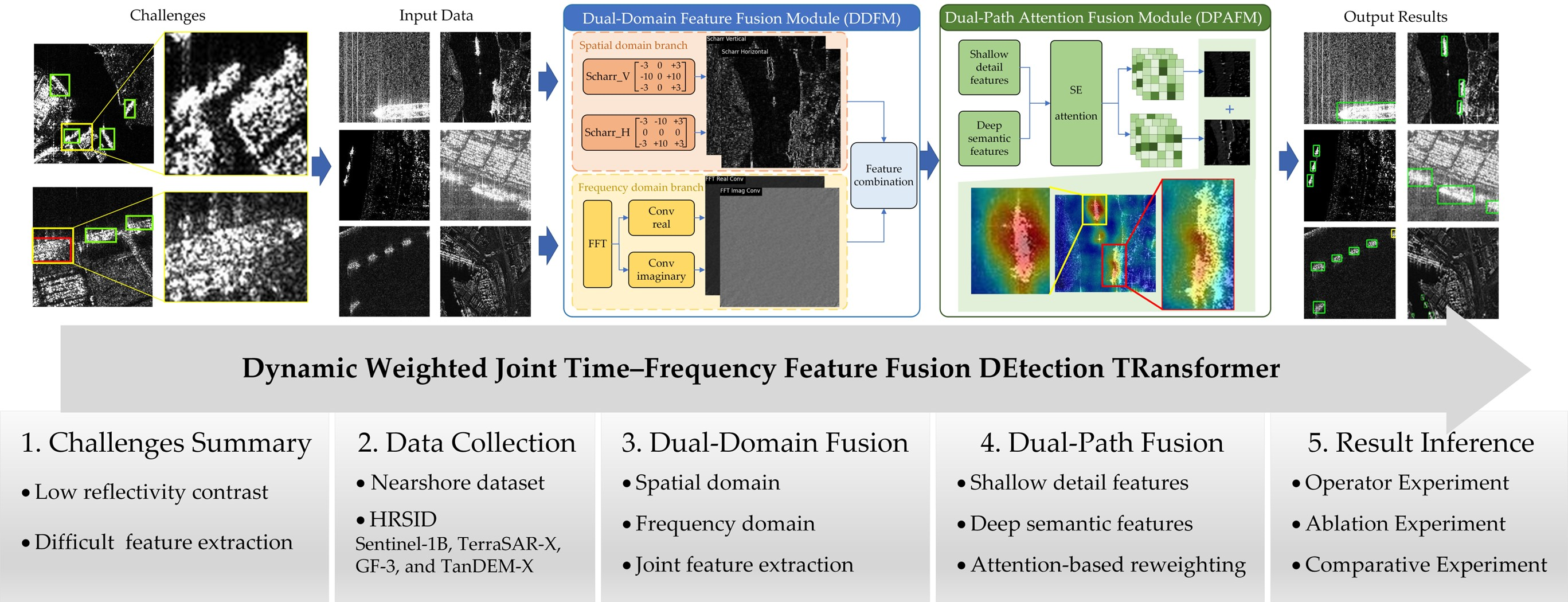 Dong, T.; Wang, T.; Han, Y.; Li, D.; Zhang, G.; Peng, Y. DWTF-DETR: A DETR-Based Model for Inshore Ship Detection in SAR Imagery via Dynamically Weighted Joint Time–Frequency Feature Fusion. Remote Sens. 2025, 17, 3301. https://doi.org/10.3390/rs17193301