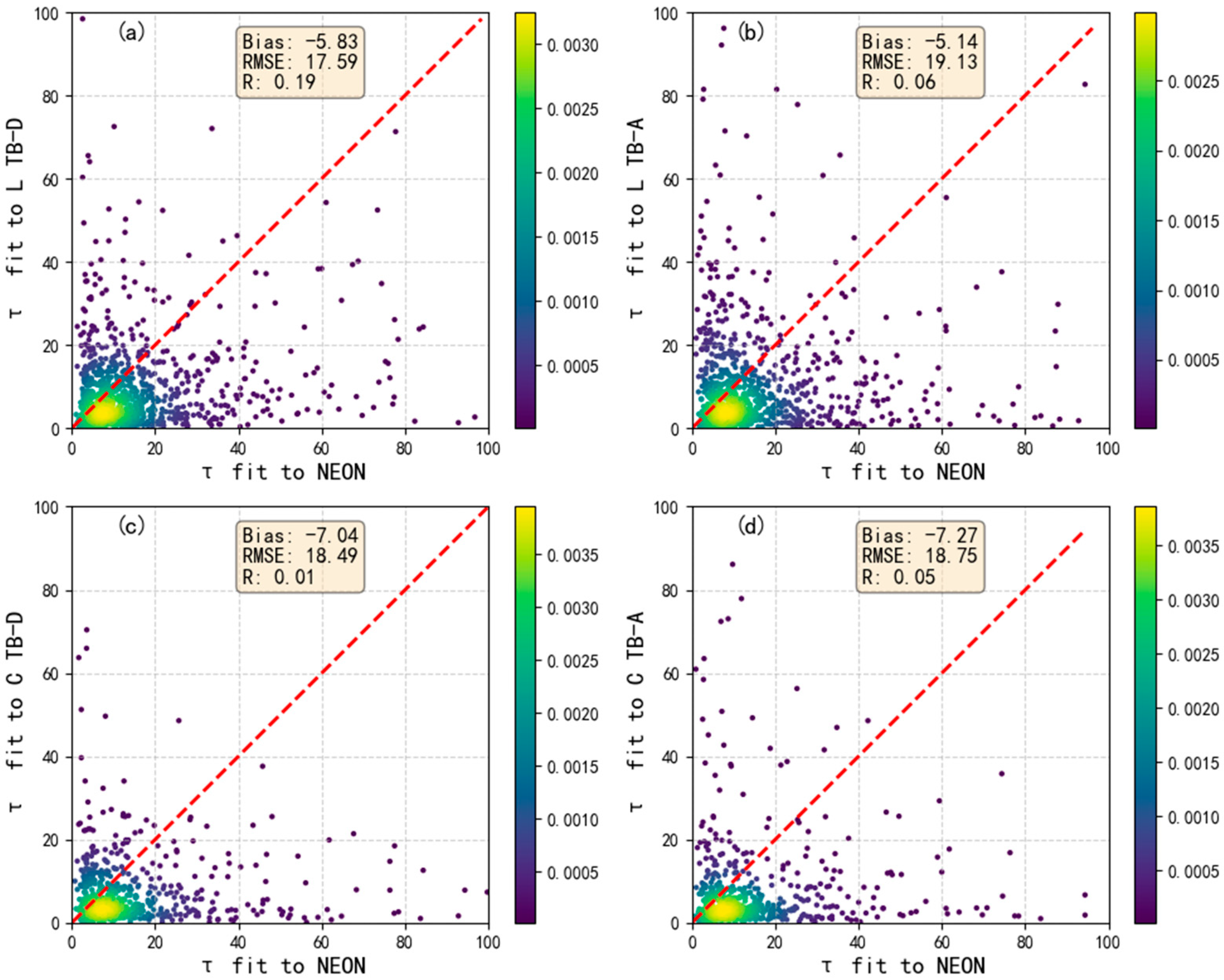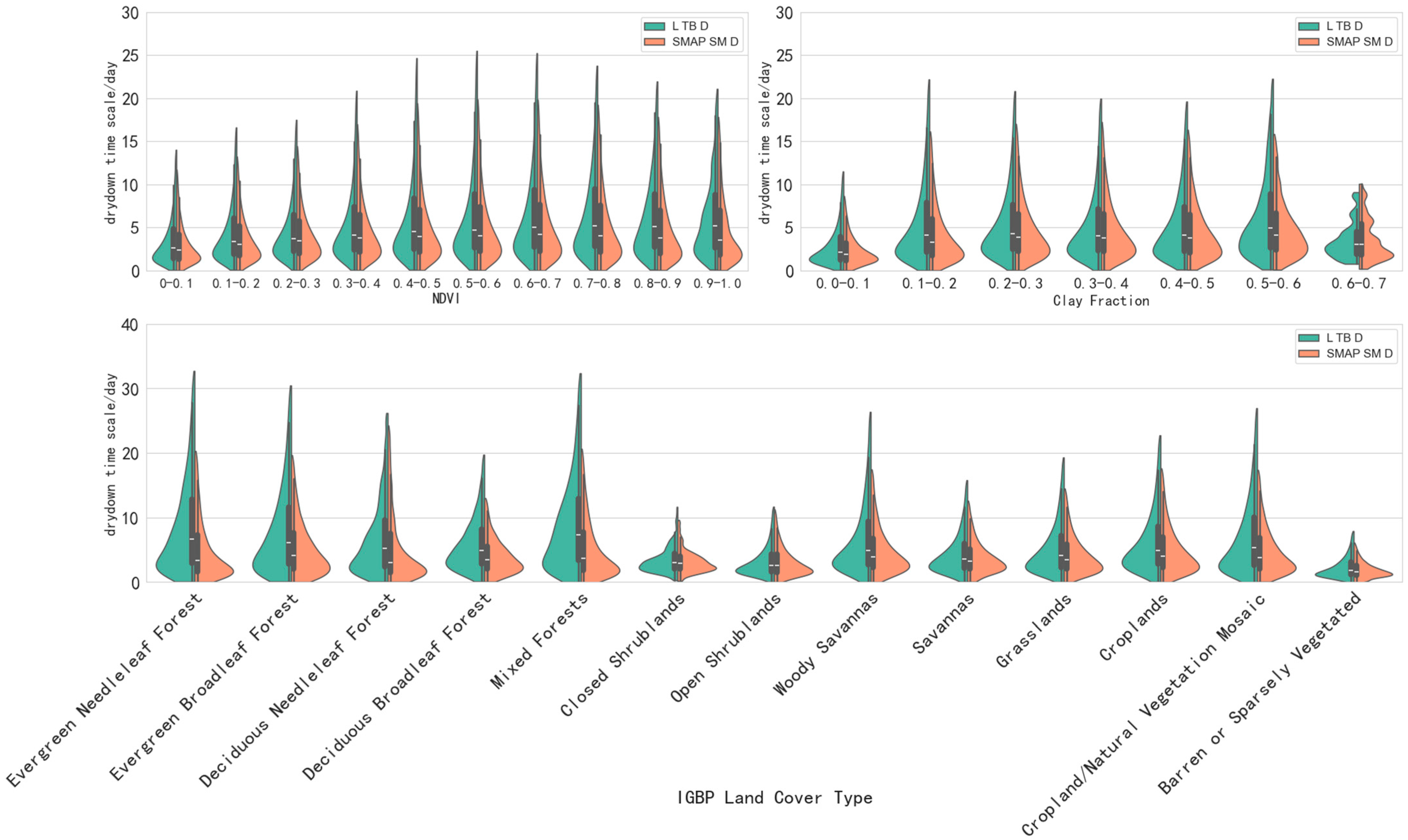 - Soil drydown time scale (τ) follows a depth-dependent pattern: AMSR2 C-band TB (0~3 cm) < SMAP L-band TB (0~5 cm) < NEON in situ observations (4~8 cm); τ is sensitive to NDVI (NDVI < 0.7) and climate types (L-band more sensitive than C-band) but insensitive to soil texture.