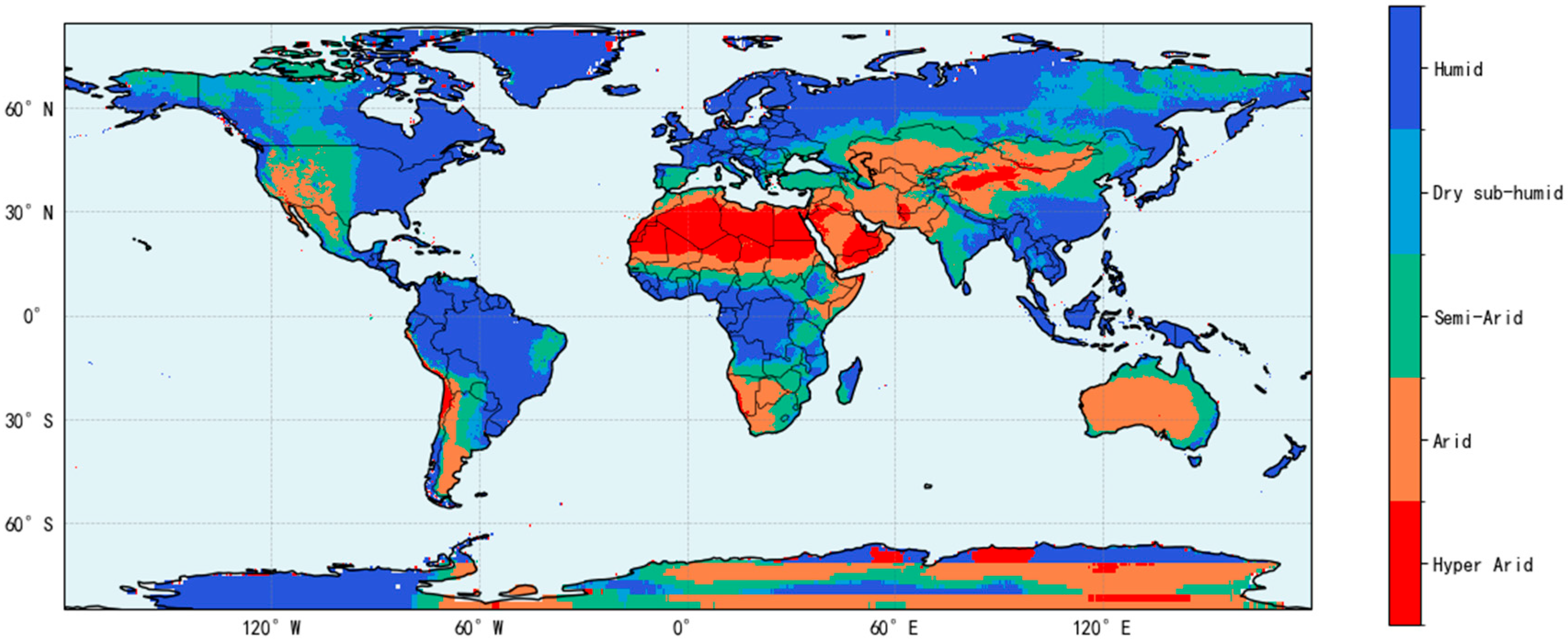 - Zomer, R.J.; Xu, J.C.; Trabucco, A. Version 3 of the Global Aridity Index and Potential Evapotranspiration Database. Sci. Data 2022, 9, 409. [Google Scholar] [CrossRef]