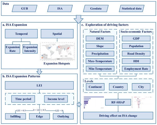 Using a global ISA dataset, the study first analyzed the temporal and spatial expansion of the global ISA from 2001 to 2020. Then we analyzed the global ISA expansion patterns over 20 years and every 5 years. In order to reveal the differences in ISA expansion patterns in regions with different economic levels, the study further classified ISA expansion patterns according to the national income levels given by the World Bank. Finally, combined with geodata and statistical data, the study explored the driving factors of ISA at the continent, country, and city levels by using the RF method and SHAP value, so as to compare their similarities and differences.