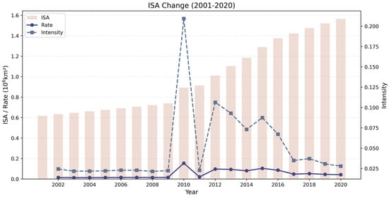 Global ISA continued to increase across the study period (2001–2020). The ISA has grown by 0.94 million km2. It was found that the rate of global ISA expansion did not increase consistently from 2001 to 2020. The rate of change in ISA was steady over the period 2001 to 2009 and reached a maximum in 2010. This may be related to the recovery of the global economy after the 2008 financial crisis, as the acceleration of urbanization and infrastructure construction may have led to the rapid growth of ISA. From 2010 to 2020, there were drastic fluctuations in the rate of ISA change; the average rate was higher than that in 2001–2009. Figure 2 shows the specific changes in ISA.