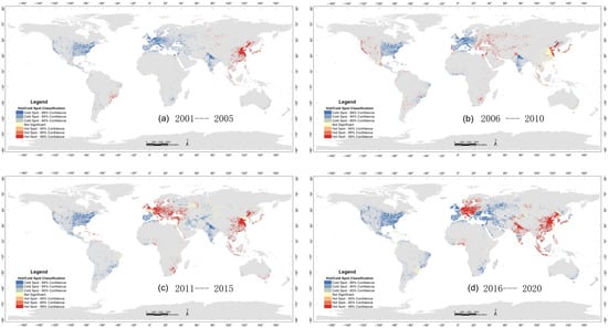 From 2001 to 2005, hotspots of ISA change were mainly concentrated in eastern China and eastern Brazil. From 2006 to 2010, hotspot areas appeared in northeastern China, the western United States, and the border region of Europe and Asia. From 2011 to 2015, there were more hotspot areas in eastern Europe, and hotspot areas appeared in southern Africa and Southeast Asia. From 2016 to 2020, hotspot areas appeared in northeastern India. The distribution of hot and cold spots at different time periods is shown in Figure 7.