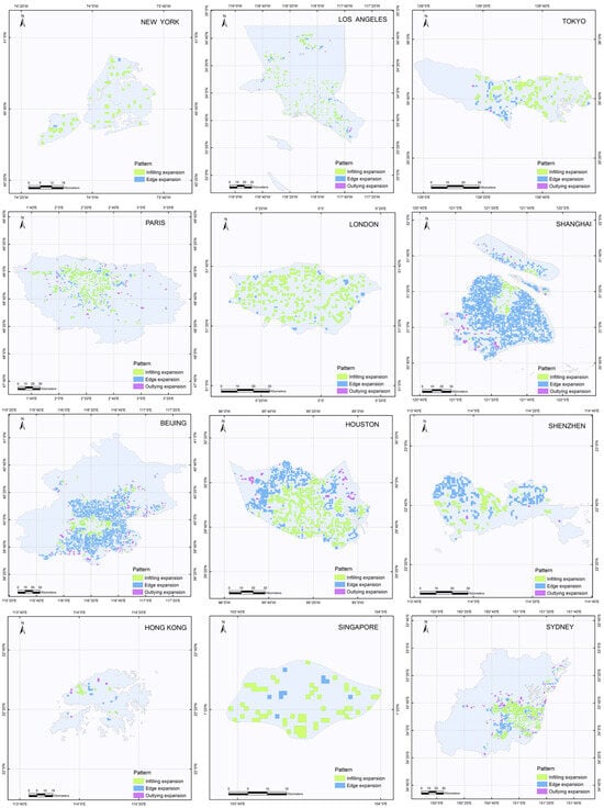 Figure 9 shows the ISA expansion patterns of 12 cities. It can be seen that Beijing, Shanghai, and Houston have extensive expansion areas. Among the three cities in the United States, the ISA expansion in Houston is more significant, with infilling expansion mainly in the central area and edge expansion in the periphery. Los Angeles and New York exhibited far less ISA expansion, indicating a steady rate of development. ISA expansion in Tokyo is mainly in the east. London’s expansion areas are more spread out across the city, with infilling expansion as the main type. The ISA expansion in Paris is mainly in the north-central region. The ISA expansion in Sydney is mainly along the eastern coast, with infilling expansion as the main type, followed by edge expansion. The patterns of Beijing and Shanghai are relatively similar: the central areas are mainly infilling expansion, surrounded by large areas of edge expansion, with many fewer outlying expansion areas scattered in the periphery. In Shenzhen, the edge expansion area is mainly in the northwest and northeast, while the infilling expansion area is mainly in the center, with a small portion in the southwest. The expansion of ISA in Hong Kong is mainly distributed in the north, with a small amount in the central region. The ISA expansion in Singapore is also sparse, with more infilling expansion than edge expansion.