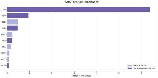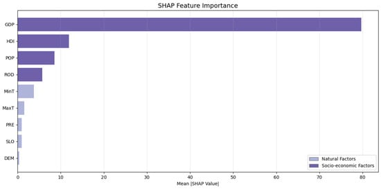 Driving factor data include geographic data and statistical data. The DEM data used in the driving factor exploration are from GEBCO (https://download.gebco.net/ (accessed on 7 March 2025)), with a spatial resolution of 15 arc-seconds (about 450 m). The slope is calculated from the DEM. The temperature and precipitation data are from Terraclimate [39] with a spatial resolution of 1/24° (about 4 km). The annual data are calculated by adding the monthly data. The global road network data are from OpenStreetMap (OSM). The global road density is obtained after processing.