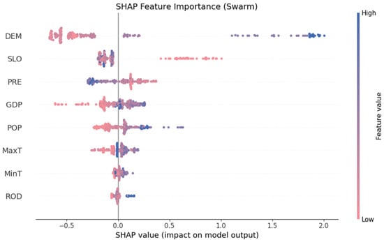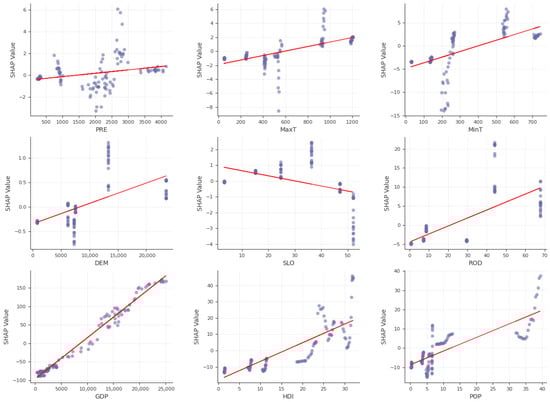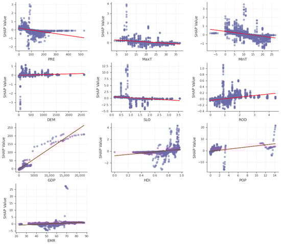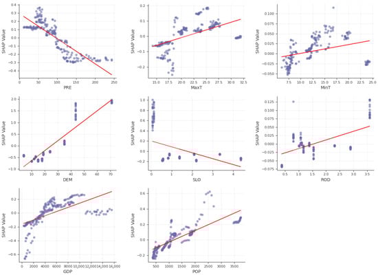 However, RF is not very effective at assessing positive and negative correlations between independent variables and dependent variables [45]. SHAP compensates for the weakness of RF in factor interpretability [48,49]. SHAP effectively utilizes these differences to calculate the positive or negative effects of each feature by using the Shapley value [35]. In summary, the combination of RF and SHAP can explore the positive or negative effects of factors on ISA change. The Shapley value of each feature is calculated using the following formula: