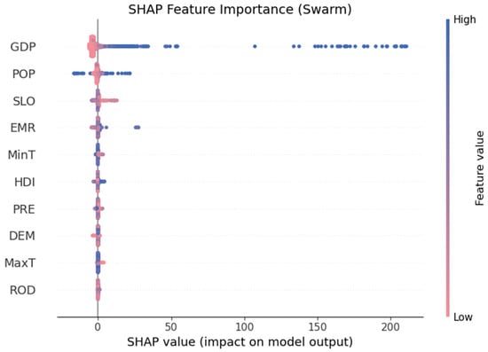 As shown in Figure 10, Figure 11 and Figure 12, the correlations between driving factors and ISA were analyzed at the continent, country, and city levels. The Pearson correlation coefficients focus on linear relationships, while the RF-SHAP results reveal the overall contribution of the features in the model, including both linear and nonlinear relationships. Combining Pearson correlation coefficients and RF-SHAP results provides a more comprehensive understanding of the impact of features on model predictions, thus improving model interpretability [51]. It can be seen that the correlation of the same factor with ISA may be different at different levels. For example, precipitation and temperature factors show a positive correlation with ISA at the continent level but a negative correlation at the country and city levels.