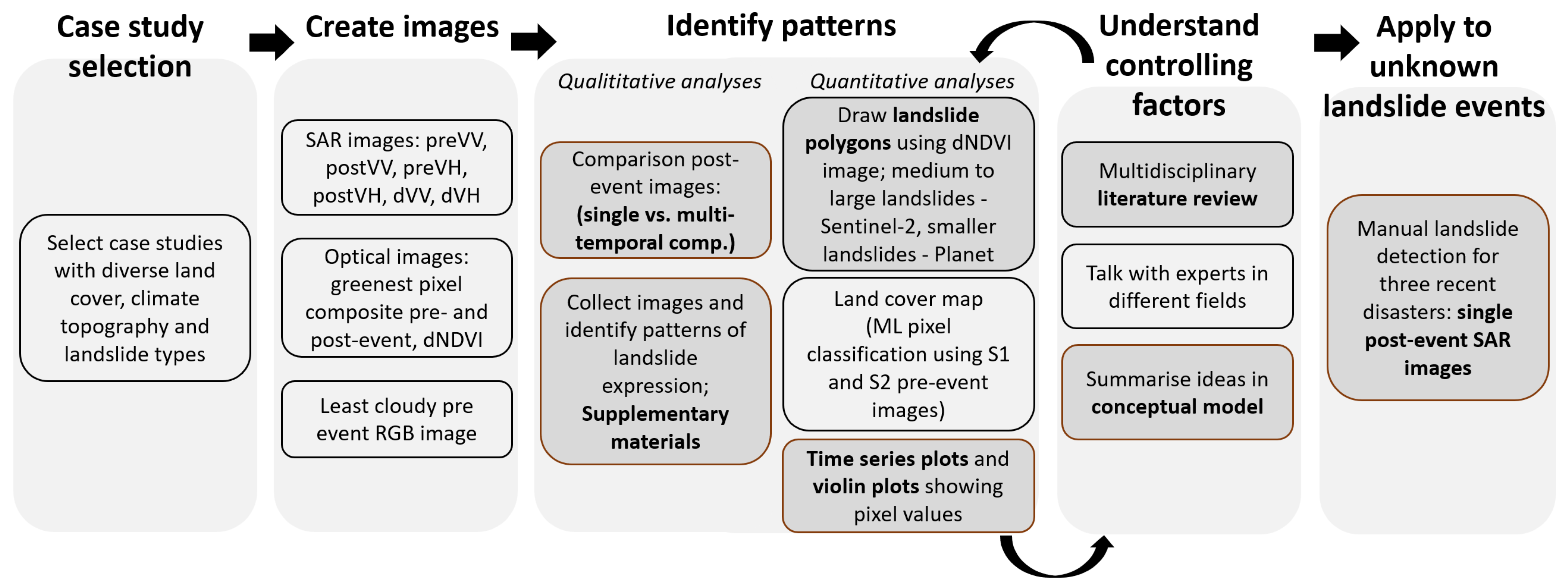 - What patterns and trends in the spatial and temporal expression of landslides in SAR backscatter intensity data can be identified from the 30 case studies?