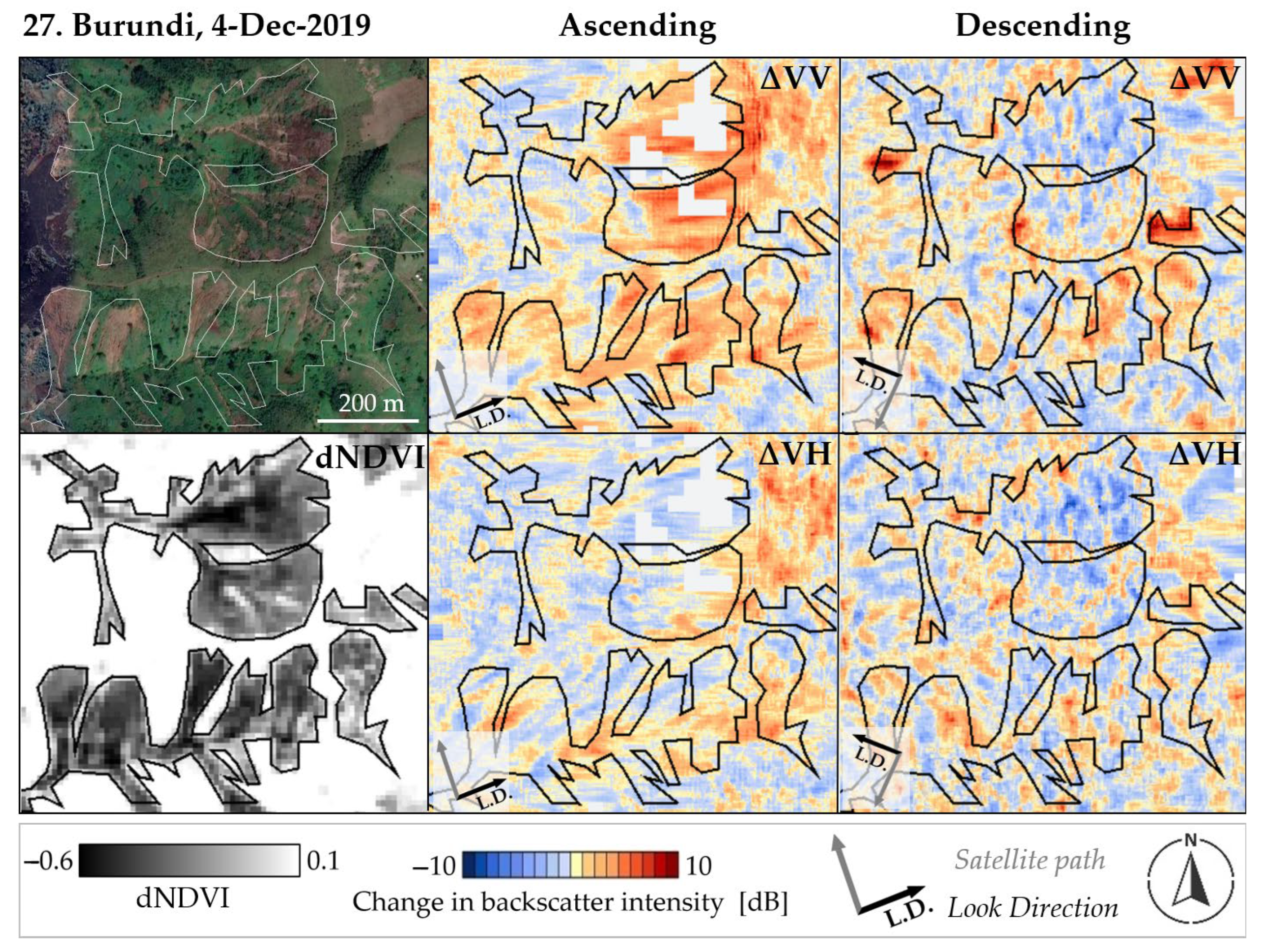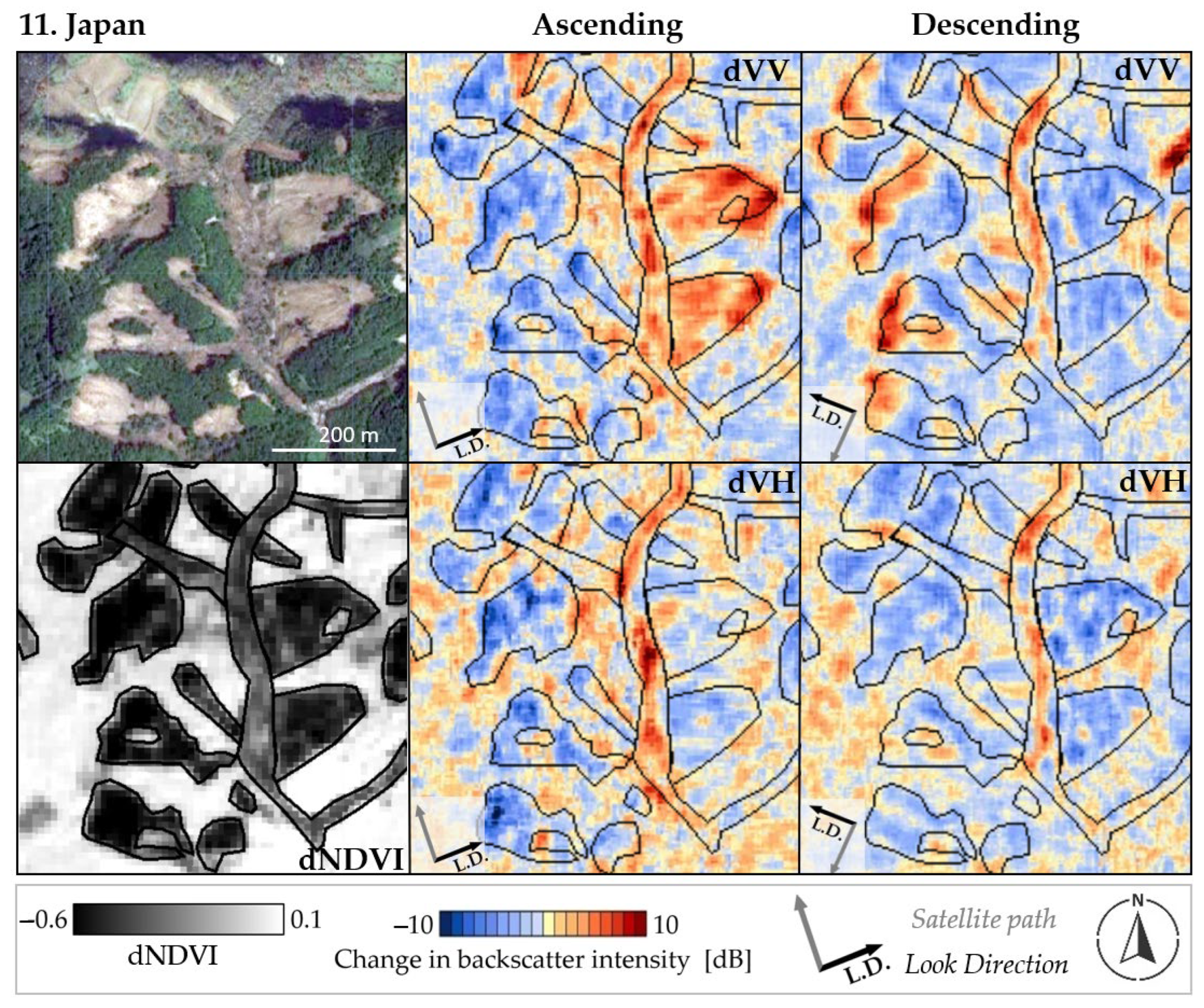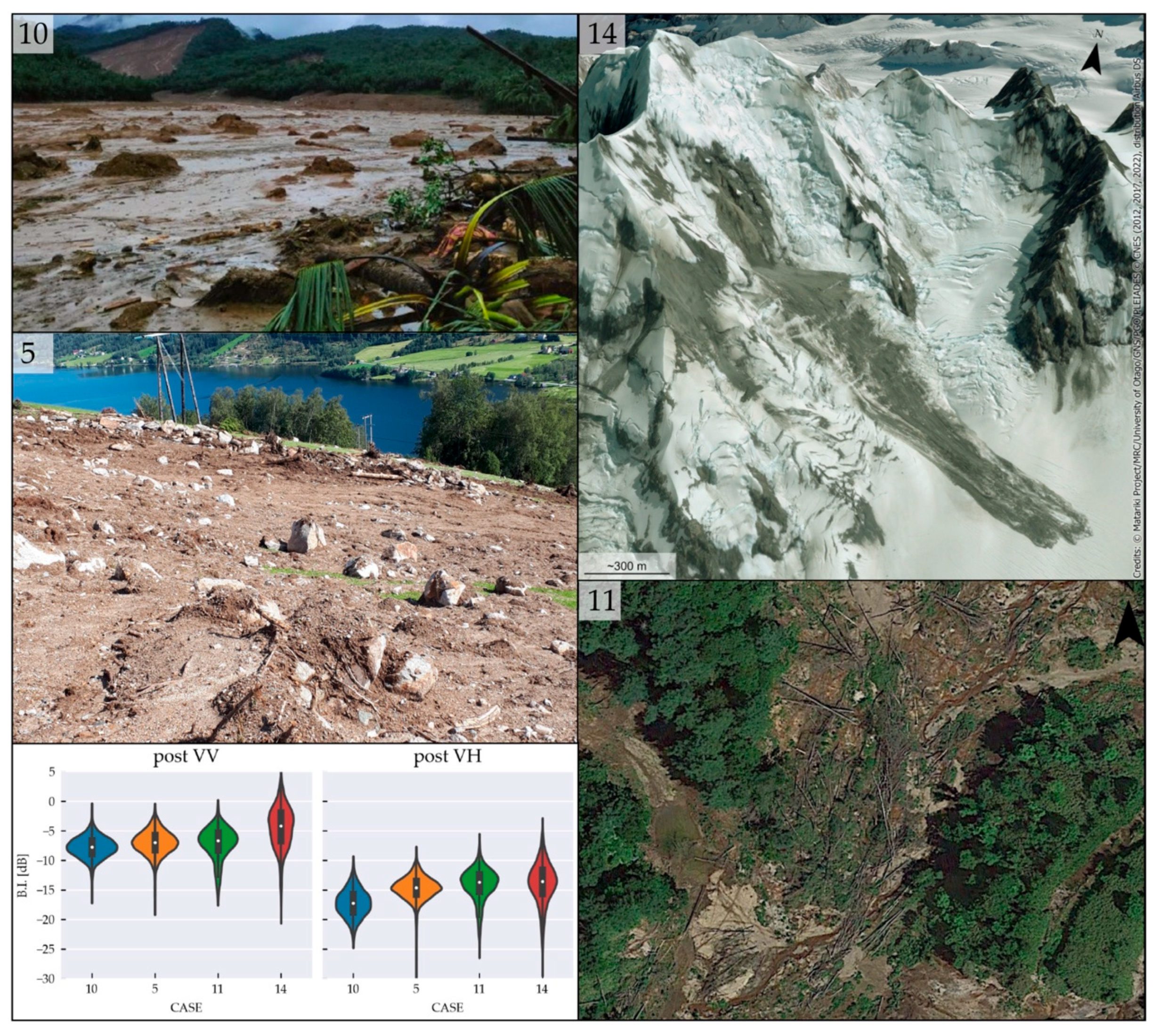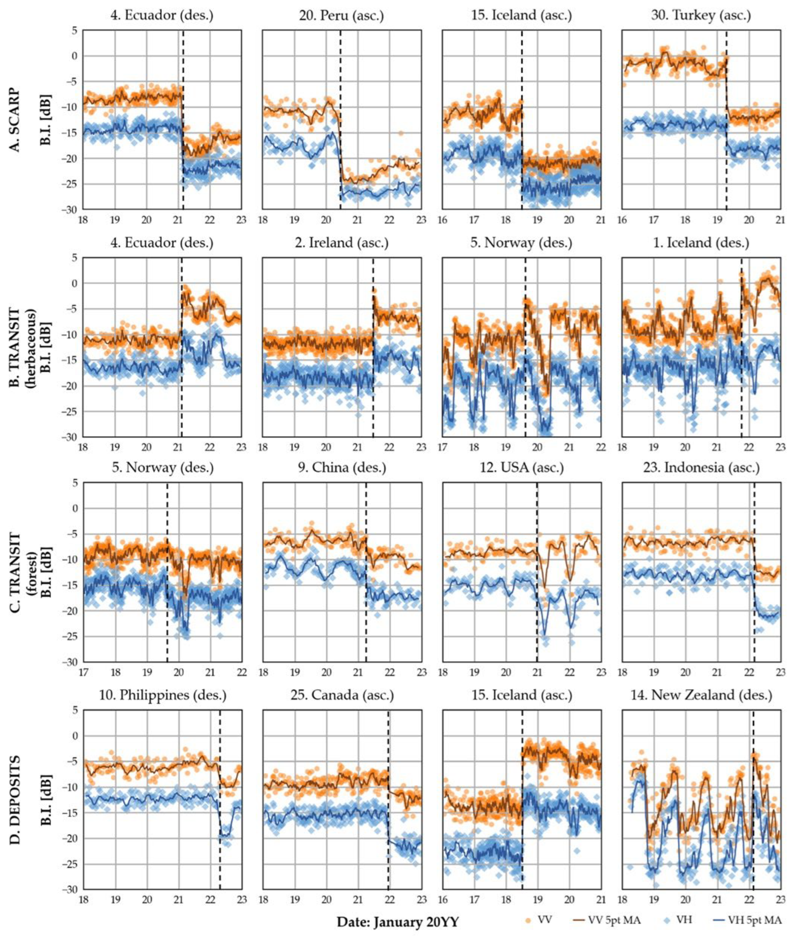 - (D) Deposits: Cases 10 and 25 from the Philippines and Canada occurred in forested areas and had flat deposits, showing decreases in backscatter intensity of around 6 to 8 dB in VH. Conversely, cases 15 and 14, which occurred in Iceland and New Zealand in the tundra and on a glacier, showed very strong increases of around 13 to 18 dB in VV.