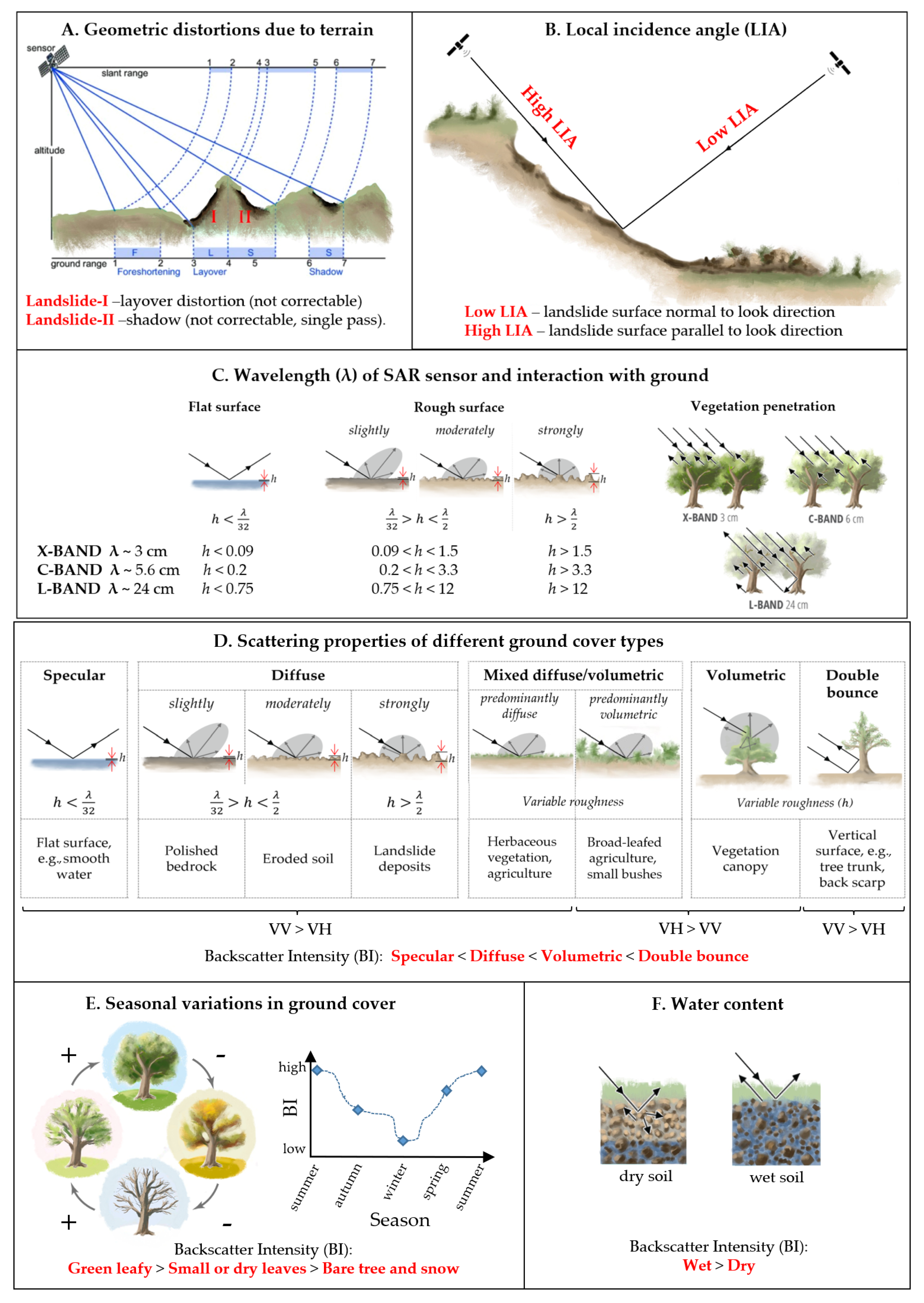 - Terrain and geometric distortions: In Figure 11A, it is shown how the position of a landslide in the terrain relative to the sensor determines whether the landslide signal will be affected by geometric distortions (including layover, shadow and foreshortening). It is seen that Landslide-I would be visible to the sensor; however, it would be distorted due to layover, while Landslide-II would not be visible to the sensor, as it is in the shadow zone. The distortion of Landslide-I can be corrected with a terrain correction, while the distortion of Landslide-II can be detected if images from both ascending and descending orbits are available.