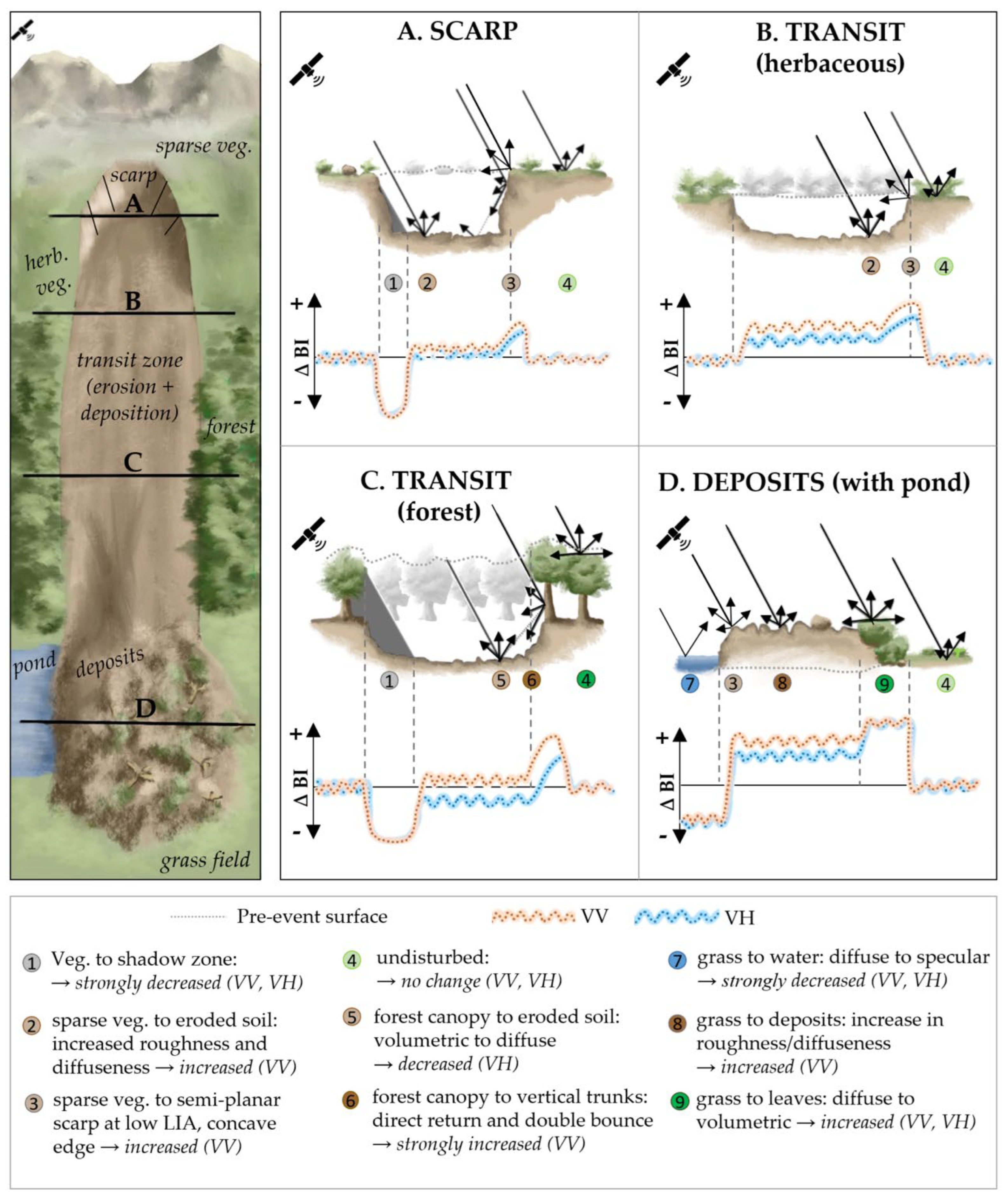 - (C) TRANSIT (forested): The pattern illustrated for landslide transit zones in forest is very similar to the pattern described by [55] from drainage canals that are constructed within rainforests prior to deforestation. The changes relate to (1) radar shadow on the edge nearest to the sensor. Then at (5), a change from forest to bare soil produces a decrease in VH due to the reduction of volumetric scattering, and possibly a slight increase in VV, depending on the roughness of the surface. Finally, at (6), increased backscatter intensity on the farthest edge from the sensor occurs due to a change from forest to a new near-vertical surface of the scarp and tree-trunks, which produces direct and double bounce scattering, increasing the energy returned to the sensor.