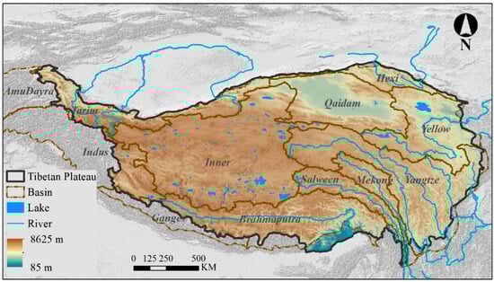 The Tibetan Plateau is located between 26°00′–39°47′N and 73°19′–104°47′E, with an average elevation exceeding 4500 m and covering an area of approximately 2.5×106 km2. It is known as the “Asian water tower”, contributing to most major rivers in Asia [54]. The total area of lakes on the TP is estimated to be around 50,000 km2, with most lakes located at altitudes between 4000 and 5000 m [55]. This study focuses on 120 lakes across the plateau, encompassing most major lakes with areas greater than 40 km2 (Figure 1). These lakes were selected based on the Records of Lakes in China [56], and detailed lake information is provided in Supplementary Table S1.