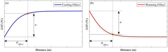 Previous studies have primarily focused on the cooling effect of rivers, reservoirs, and lakes during summer, with results often well described by a sigmoid model [69,70]. In contrast, lake warming effects remain less studied. This study extends the sigmoid model to incorporate both cooling and warming effects.