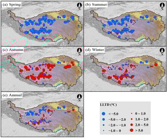Spatial distribution of mean lake–land temperature differences (LLTDs) within 10 km buffer zone for each season (a–d) and annually (e). Seasons are defined as follows: spring (March–May), summer (June–August), autumn (September–November), and winter (December–February).
