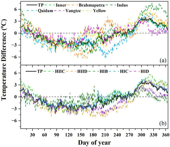 Seasonal LLTD variations exhibit distinct patterns across different basins. The Inner Basin, which contains the largest proportion of lakes (Table 1), largely governs the overall LLTD behavior of the TP. For the ten lakes within the Yangtze and Yellow River Basins (Figure 4a), the LLTD remains negative from spring through June, increases thereafter, and declines again in September. This pattern likely arises from the interplay among radiative forcing, thermal storage release in lakes, and evaporation effects—where terrestrial evaporation suppresses land temperature while lake evaporation modulates water surface cooling. In the Qaidam Basin, lakes with prolonged ice cover and delayed melt exhibit an LLTD minimum in early October, followed by a rapid increase. The Indus Basin shows the highest LLTD peak (7.65 °C) in late November, surpassing other basins; if sustained, this increase could influence local humidity and lake thermal stratification. Although seasonal LLTD patterns are generally consistent across climatic zones (Figure 4b), arid regions [72]—including the high-altitude sub-frigid arid zone (HID) and the high-altitude temperate arid zone (HIID)—reach their LLTD minimum in late July, lagging behind other zones.