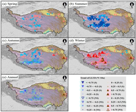 Figure 5 shows the interannual variations in LLTD within 10 km buffer zones across different seasons (Figure 5a–d) and on an annual basis (Figure 5e) from 2000 to 2022, as determined by the Mann–Kendall trend test [73,74]. Annually, 79.2% of the lakes exhibited a decreasing trend in LLTD, which can be attributed to multiple factors, such as glacial meltwater inflow, evaporative cooling, lake expansion, snow cover loss, urbanization, and more rapid climatic response of land compared to lakes. Seasonally, the average summer LLTD decreased at a rate of –0.56 °C per decade, representing the largest contributor to the annual decline (Figure 5b). This pattern is mainly driven by two factors: (i) the predominance of glacier-fed lakes, which constitute 63% of the studied lakes and exhibit suppressed summer warming compared to adjacent land, and (ii) enhanced evaporative cooling that counteracts lake temperature increases [75]. In contrast, during winter, 87.5% of the lakes showed increasing LLTD trends (Figure 5d), with an average rate of 0.3 °C per decade. This trend occurs because TP lakes warm more significantly in winter than in other seasons [53]. Furthermore, reduced lake ice cover enhances radiative heat absorption, resulting in more pronounced lake surface warming relative to land during winter. Spatially, lakes located in the southern and northwestern TP show a declining trend in annual LLTD, with statistically significant decreases (p < 0.05) during summer. In autumn, southern lakes show a decreasing trend in LLTD, whereas northern regions experience a more pronounced warming-driven increase in LLTD in winter. The decrease in autumn LLTD over southern TP lakes is consistent with regional “warm-wet” trends, where lake expansion and increased evaporation may further slow down the lake warming effect.