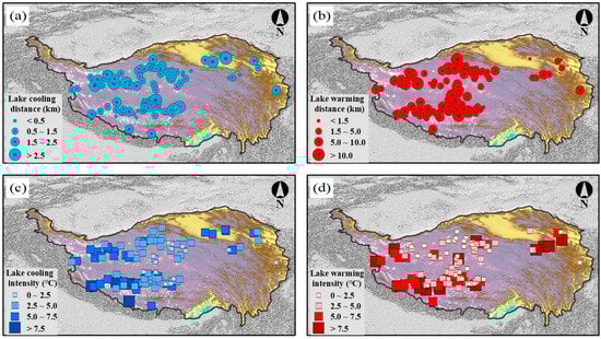 Spatial patterns of the lake influence distance and influence intensity for models with R2 > 0.4: (a) lake cooling distance, (b) lake warming distance, (c) lake cooling intensity, and (d) lake warming intensity.