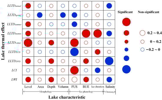 Partial correlation coefficient between lake thermal effects and lake characteristics. (Level, FUS, BUE, and ice duration represent the water level, freeze-up start date, break-up end date, and ice cover duration of lakes. and represent cooling effect intensity and warming effect intensity. , , , , , , and represent the lake–land temperature difference annually, in spring, in summer, in autumn, and in winter, as well as in cooling effect distance and in warming effect distance.).