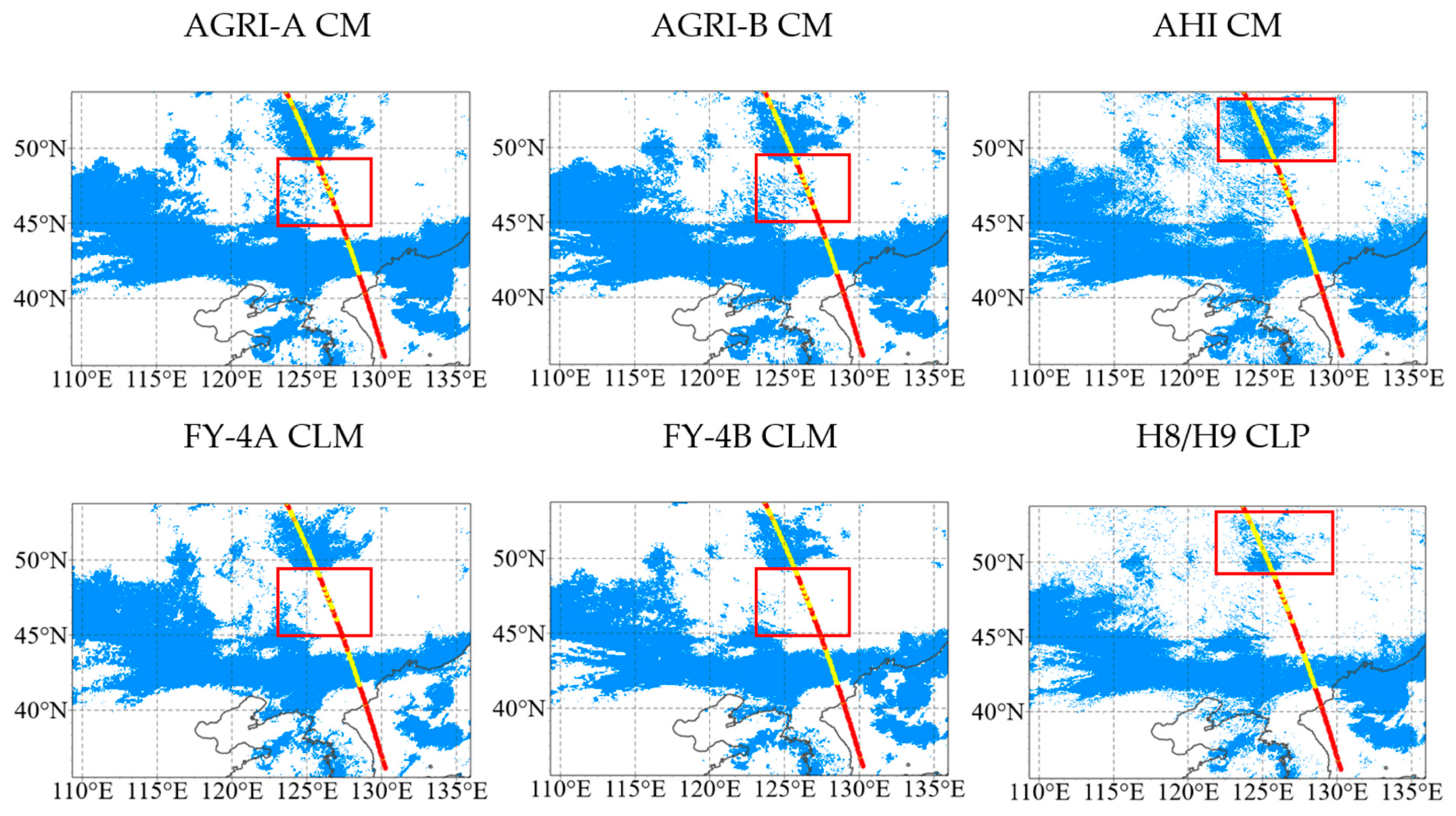 - Wang, X.; Min, M.; Wang, F.; Guo, J.; Li, B.; Tang, S. Intercomparisons of cloud mask products among Fengyun-4A, Himawari-8, and MODIS. IEEE Trans. Geosci. Remote Sens. 2019, 57, 8827–8839. [Google Scholar] [CrossRef]