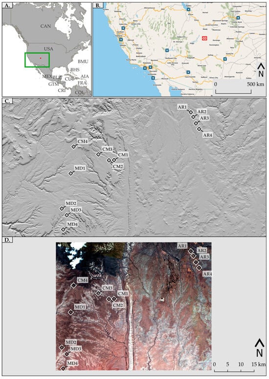 (A) A subset of the world map illustrating the national boundaries in a subset of north America. The green rectangle indicates the area presented in (B). A map illustrating the study sites’ location within the western United States (the red cross-hatched square within the map). The map’s base layer is courtesy of ÖPNV-Karte. (C) A hillshade map illustrating the topography of the region of south-eastern Utah in which our study takes place (source: Prizren Global Terrain). (D) An RGB map covering the same geographic extent as panel C, with Kannenberg et al.’s 12 study sites marked [8]. The panel’s RGB base layer is from PlanetScope’s Dove-2 satellite network, harmonised to Sentinel-2’s image output. The image was captured on the 29/05/2019.