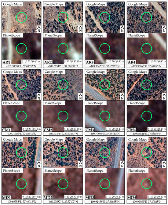 Kannenberg et al.’s [8] study included 12 sites, each defined as a 15-metre radius circle situated on broadly level terrain. Figure 1 illustrates the region where Kannenberg et al.’s [8] study took place, alongside the sites’ location within western North America. Figure 2 illustrates Kannenberg et al.’s [8] 12 study sites at a very fine spatial resolution. The image makes clear the dry environs typical of southeastern Utah and serves to visualise the size and density of trees in each forest ecosystem. Even though PlanetScope offers a class leading combination of temporal and spatial resolution compared to other satellite imagery providers, PlanetScope’s spatial resolution of 3 m × 3 m is not suitable for tree crown delineation or the calculation of leaf area index values, elucidating why it was necessary to make inferences at the scale of forest stands, rather than of individual trees.