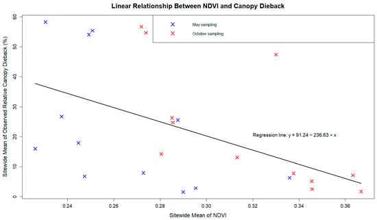 The linear relationship between the sitewide means of relative canopy dieback from Kannenberg et al.’s [8] ground-truthing data, and the sitewide mean of NDVI from the date closest to the site’s ground-truthing date.