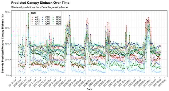 The beta regression model indicated a statistically significant negative relationship between sitewide mean NDVI and relative canopy dieback. Specifically, NDVI was a significant predictor of dieback (β = −11.97, SE = 4.39, z = −2.73, p = 0.0064, N = 24), suggesting that higher NDVI values are associated with lower levels of drought-induced canopy damage (pseudo-R2 = 0.32). The model converged after 22 iterations of the Broyden-Fletcher-Goldfarb-Shanno (BFGS) algorithm and two Fisher scoring steps, and precision (phi, hereafter denoted as “ϕ”) was estimated at 5.405 (SE = 1.533, p < 0.001).
