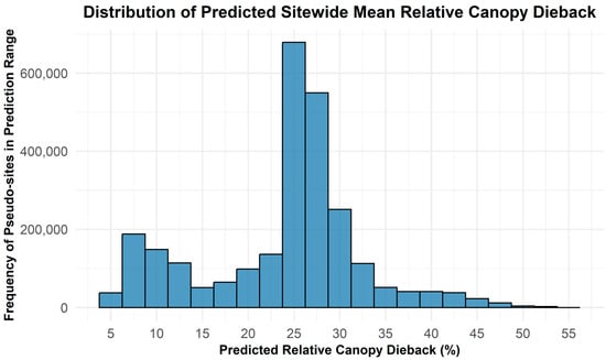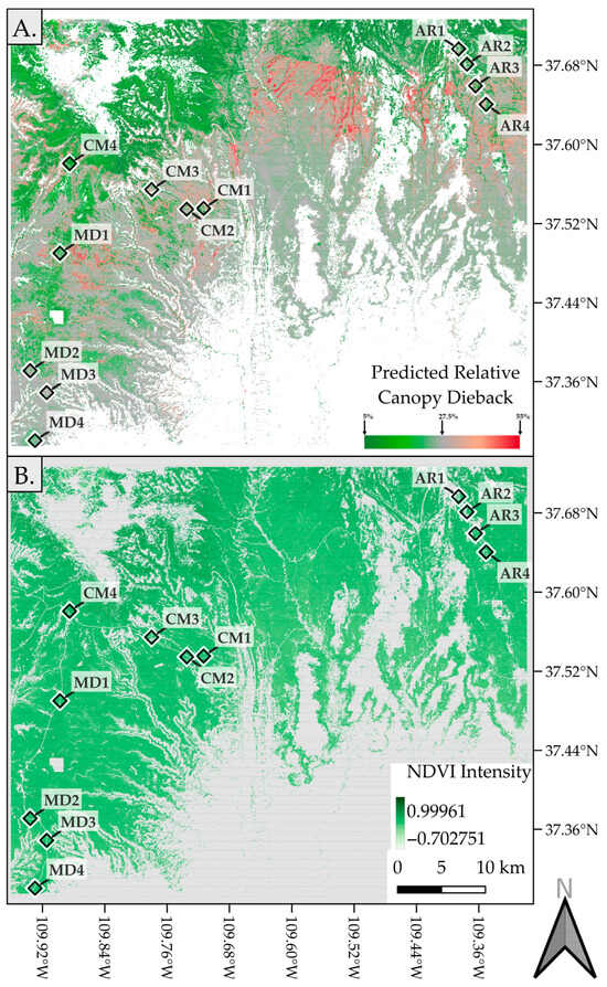 Nevertheless, the results of our spatial upscaling highlight an interesting direction for further research. As our map of predicted canopy dieback also identified the defoliation hotspots Campbell et al. [31] found, we contend that these hotspots require examination. The tree stands in these hotspots may have additional burdens affecting their response to drought stress, such as a localised outbreak of bark beetles [47], or the presence of a microclimate which prior to European colonisation of the Americas, would not have supported infilling by piñon-juniper woodlands [43,48]. Further study of these dieback hotspots may therefore shed light on the root cause of the ‘rapid and surprising’ canopy dieback observed by Kannenberg et al. [8].