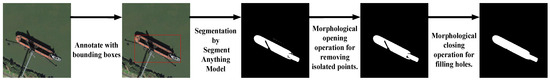 Next, we applied the SAM model [26,27] to segment the filtered images. The input to SAM consisted of the image and the corresponding label coordinates. To generate these labels, we unified the original annotations provided in the public datasets and manually corrected cases where the segmentation results were unsatisfactory. After balancing accuracy, memory requirements, and segmentation quality, we selected the ViT-L variant of the encoder for our experiments. SAM leveraged the input coordinates to identify and localize the ship targets within the image and then generated masks to extract them. Although this process effectively captured the ship targets, the resulting segmentation masks still exhibited potential defects or noise, which could adversely affect subsequent model training. To address this issue, we incorporated morphological post-processing [28] to refine the masks and further improve data quality.