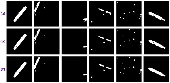During the morphological correction stage, an opening operation was first applied to suppress isolated bright noise, followed by a closing operation to fill small holes in the masks, thereby improving the overall consistency and completeness of the segmentation results. Formally, the opening operation , defined as erosion followed by dilation with a structuring element S, removes small bright spots and fragmented noise while preserving the primary structure of the target. Conversely, the closing operation , defined as dilation followed by erosion, bridges small boundary gaps and fills local voids, resulting in smoother and more continuous object contours. The combination of opening and closing thus suppresses noise-induced artifacts and repairs segmentation discontinuities, yielding more stable ship masks. Given the heterogeneity of ship images, however, parameter settings for these operations varied across samples. Therefore, each corrected mask was manually reviewed and, where necessary, adjusted to ensure that the final dataset met the required quality standards. The comparison of the effect before and after morphological school calibration is shown in Figure 2.