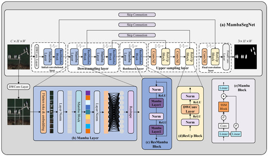 The Mamba Layer initiates by flattening and embedding the image, partitioning it into several tokens. These tokens are then mapped from their original high-dimensional space to another dimensional feature space via embedding and the integration of the Mamba module (e). At the heart of MambaSegNet lies the ResMamba Block, a core module built upon the visual Mamba module. Within this block, input features undergo an initial linear embedding before being divided into two processing paths. The first path includes feature normalization, depthwise convolution, and ReLU activation [33,34] followed by further convolution operations and feature extraction through the Mamba Layer module. Ultimately, the output of this path undergoes layer normalization and merges with features from the second path.