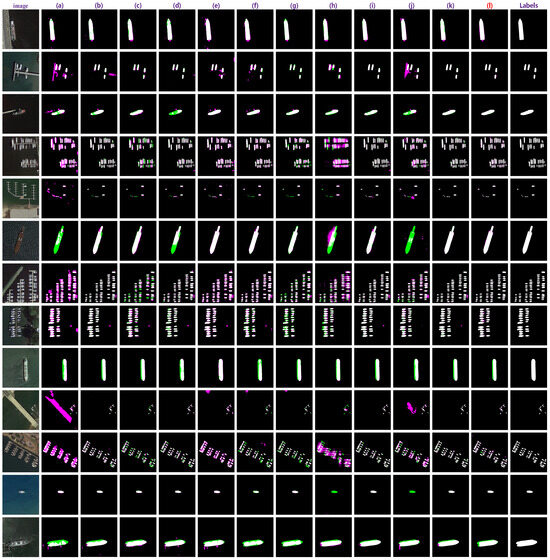 To validate the effectiveness of the proposed MambaSegNet model in remote sensing ship extraction tasks, we compared its performance with seven mainstream segmentation models, including Unet [42], Unet++ [43], DeepLabV3+ [44,45], SegNet [46], BiseNetV2 [47,48], Segformer [49], SegNext [50], SwinTransformer [35,51], PIDNet [52], DCSAUnet [53], and TransUnet [54]. Segmentation experiments were conducted on the DIOR_SHIP and LEVIR_SHIP datasets to evaluate the performance of these models, and the results were compared with the segmentation performance of MambaSegNet. The key parameter configurations for each model are as follows: the optimizer employed is Adam, with a learning rate set at 0.0001 and momentum at 0.9. The weight decay is assigned a value of 0.0010, and the batch size is 4. The model undergoes 100 iterations, with an input size of , providing foundational data to support the subsequent discussion and analysis of experimental results.