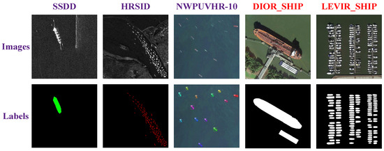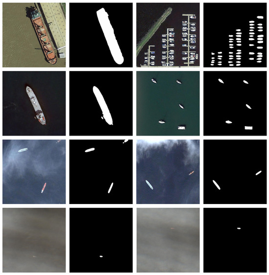 In this study, we utilized two publicly available remote sensing datasets—DIOR [24] and LEVIR [25]. These datasets contain a wide range of object categories, including airplanes, bridges, chimneys, dams, ports, ships, and storage tanks. To focus specifically on the task of ship extraction, we performed a rigorous filtering process on the images and annotations. First, images and labels unrelated to ships were removed according to the dataset category tags. Subsequently, each image was manually inspected to ensure both sufficient image quality and the clarity of the ship targets. This procedure ensured that the curated dataset only contained accurate and high-quality ship images, thereby enhancing the precision and robustness of the subsequent tasks.