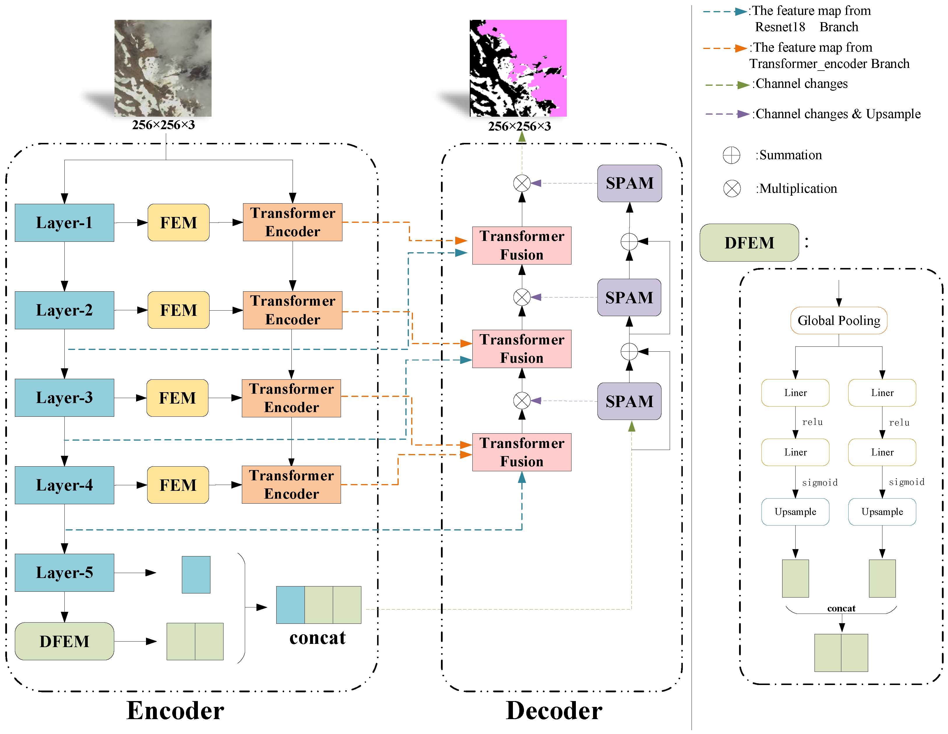 To further boost feature representation, a Feature-Enhancement Module (FEM) is positioned between the Transformer and convolutional pathways, enabling mutual guidance and adaptive information exchange. This architecture improves the model’s ability to capture subtle and scattered cloud-snow structures. Furthermore, a Deep Feature-Extraction Module (DFEM) is integrated at the deepest convolutional layer to enhance channel-level representations. By emphasizing salient feature dimensions, DFEM improves the model’s ability to capture abstract representations and leads to more precise delineation along cloud and snow contours.
