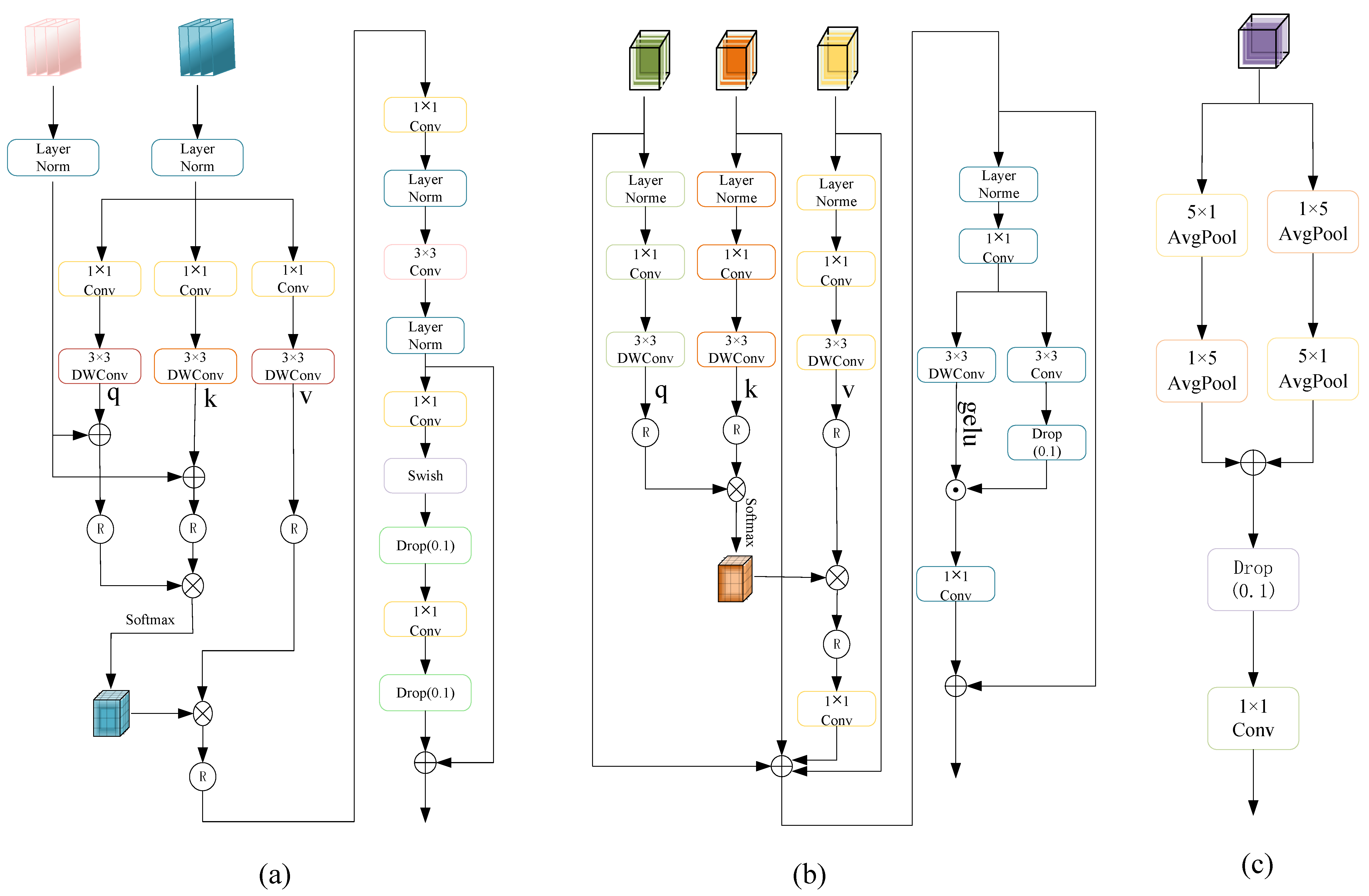 Here, , , and are derived from the original tensor after reshaping. refers to a 2D convolution with a kernel, while represents a depthwise separable 2D convolution with a kernel. R denotes the rearrangement operation, and is a learnable scaling factor that adjusts the pointwise product between and before applying the softmax function. Softmax refers to the normalized exponential function. Swish represents the Swish activation function, and Drop indicates the dropout operation.